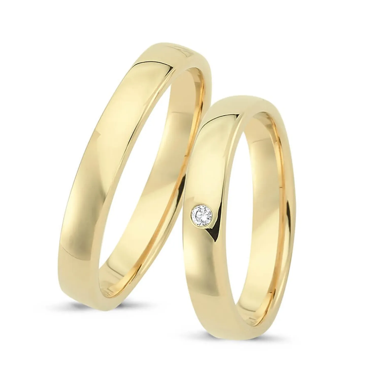 Trauringe oder Verlobungsringe mit 1 Diamant auf dem Damenring. Ein Satz schöner und klassischer Ringe mit einem Hauch von Brillanten, die sich über den Damenring ziehen.