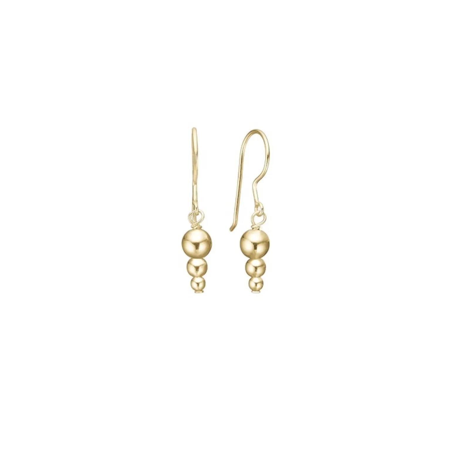 Ohrringe mit Kugelanhängern aus 8 Karat Gold. Diese feinen Ohrringe sind mit Ohrhaken gefertigt, die gut im Ohr sitzen. Insgesamt hängen 6 kleinere Kugeln in verschiedenen Größen an den Ohren.