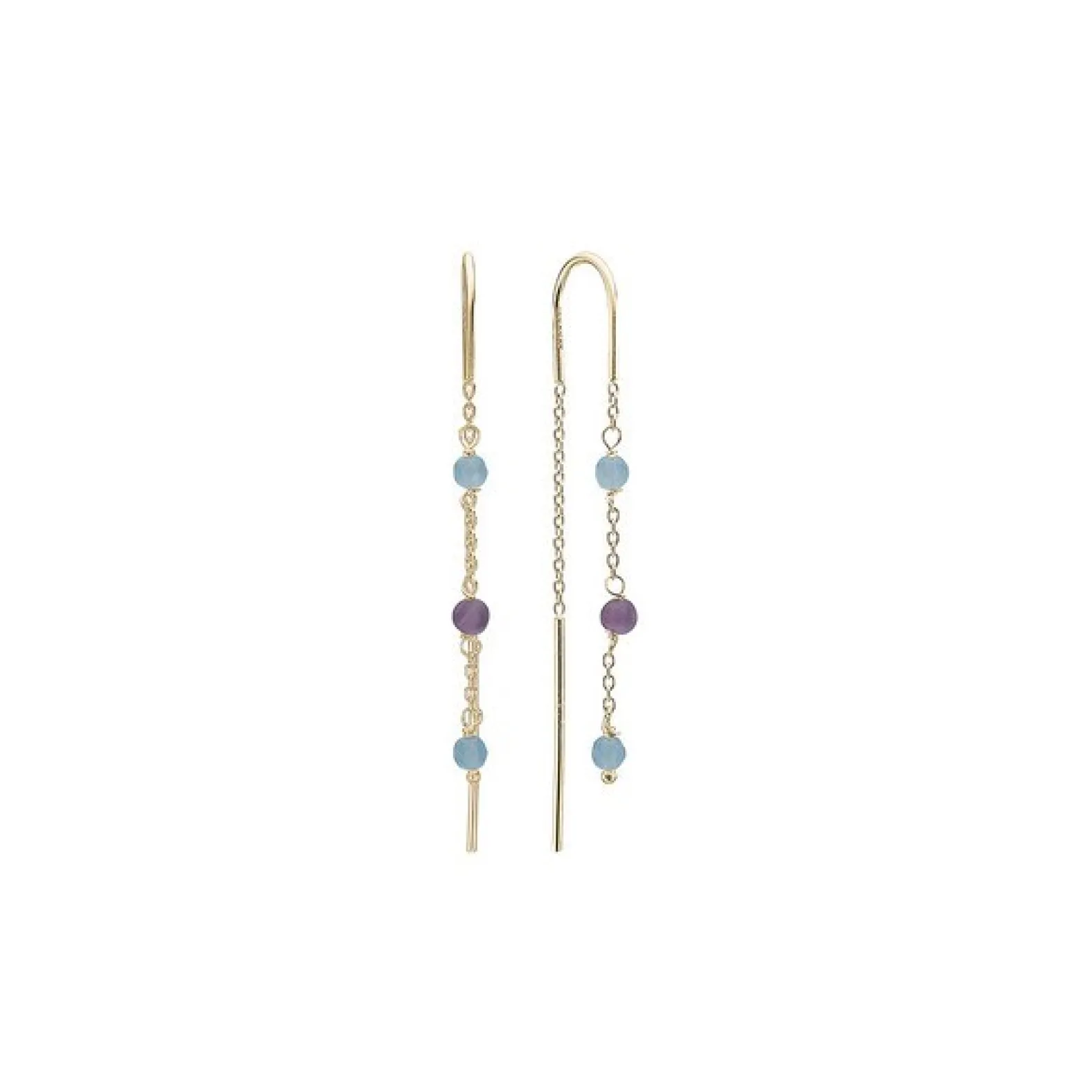 Schöne und elegante Ohrringe aus vergoldetem silber mit echten Amethysten und blauen Quarzsteinen entlang der Kette. Diese wundervollen Ohrringe können gut alleine getragen werden, sind aber auch sehr schön in Kombination mit anderen silber Ohrringen.