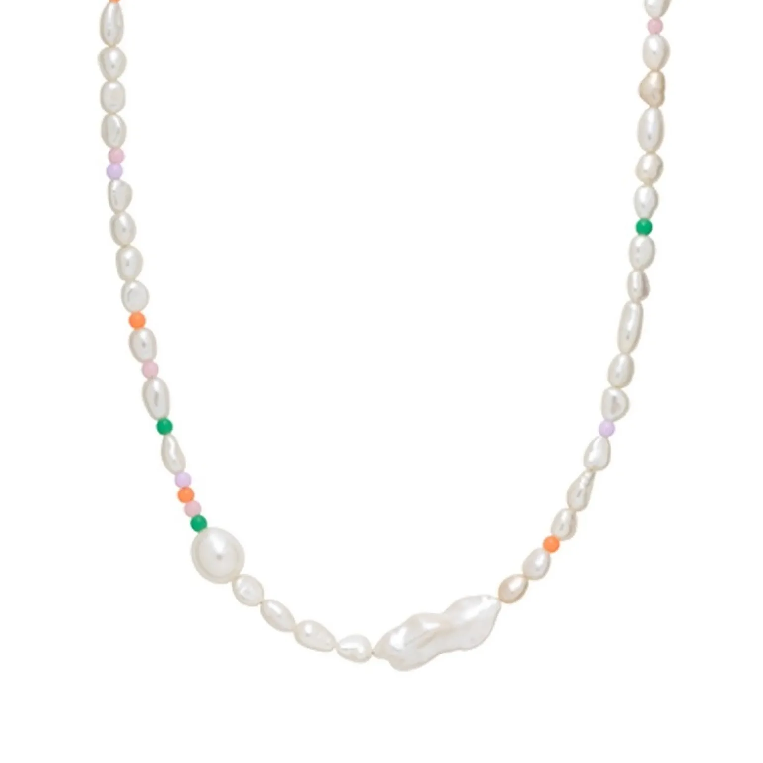 Silber Perlenkette von Anne-sofie Krab x Sistie mit farbigen Harzperlen und großen Süßwasserperlen. Die Halskette ist aus 100% recyceltem silber und hat ein kleines Verlängerungsstück von 5 cm.