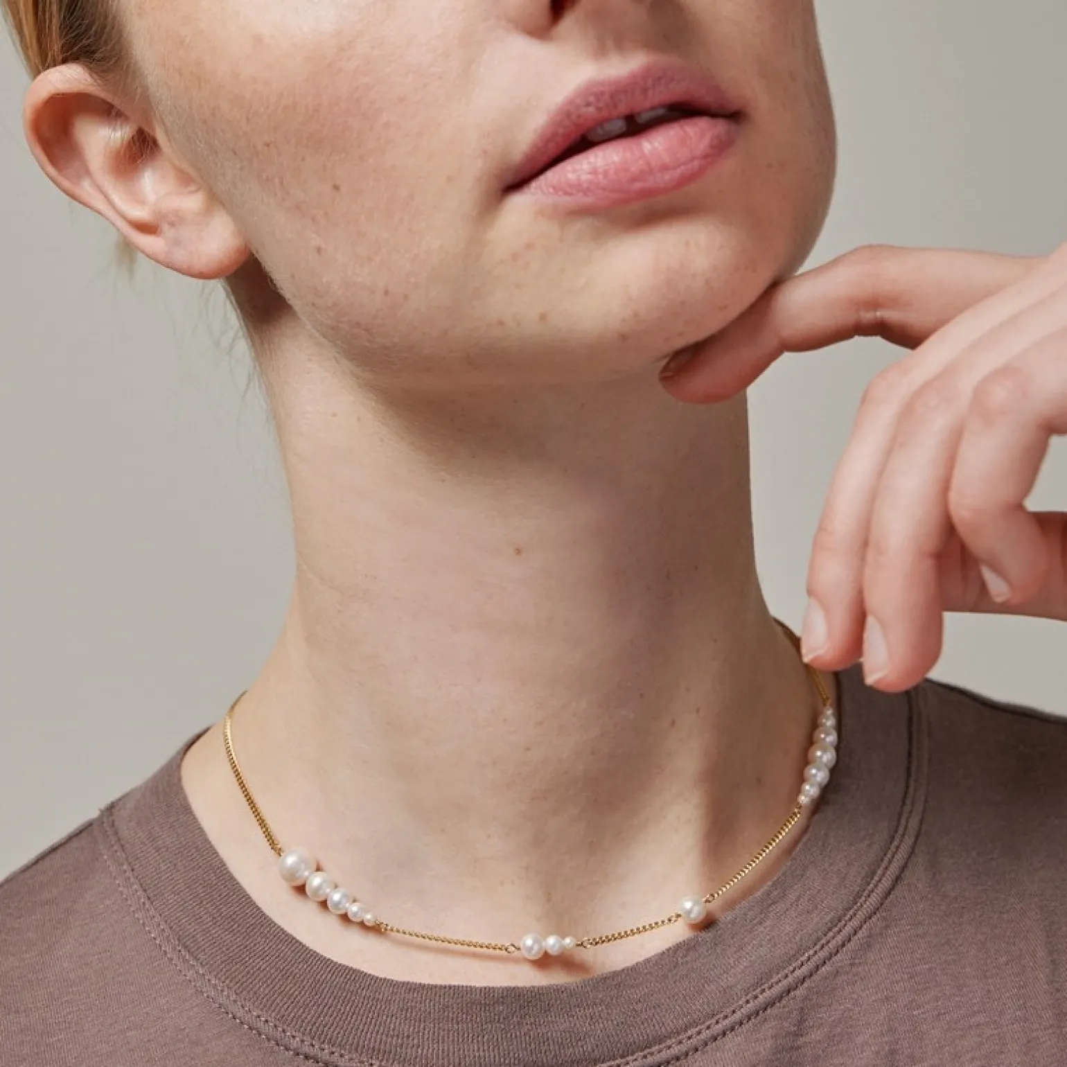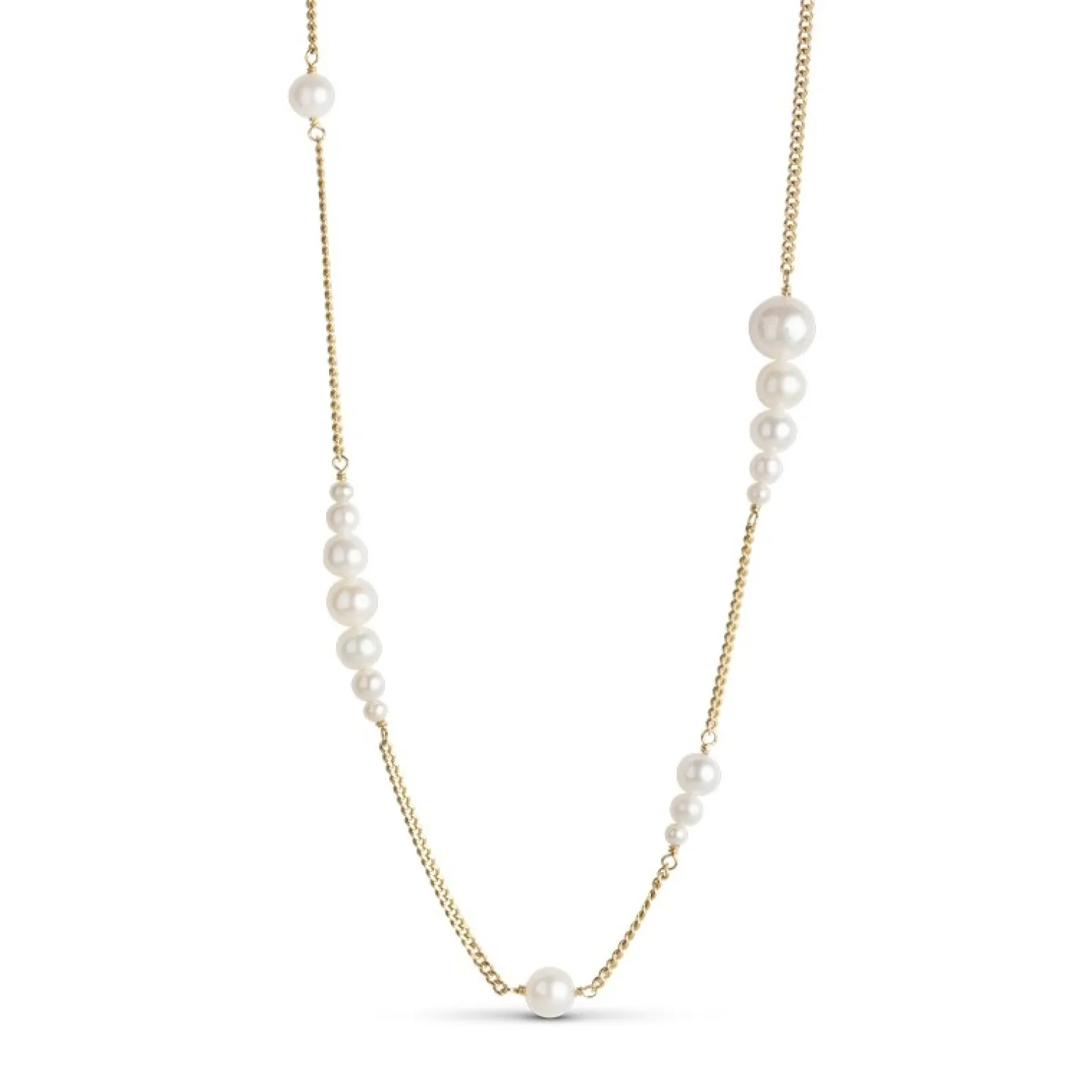 Carmen-Halskette in vergoldete silber von Enamel Copenhagen mit Süßwasserperlen. Die schöne Halskette hat eine schöne Länge von 42 cm mit einem 5 cm langen Verlängerungsstück. Dadurch kann man entscheiden, wie hoch die Kette am Hals sitzen soll. Die Perlen sind weiß und in verschiedenen Größen, was dem Collier einen ganz besonderen Look verleiht.