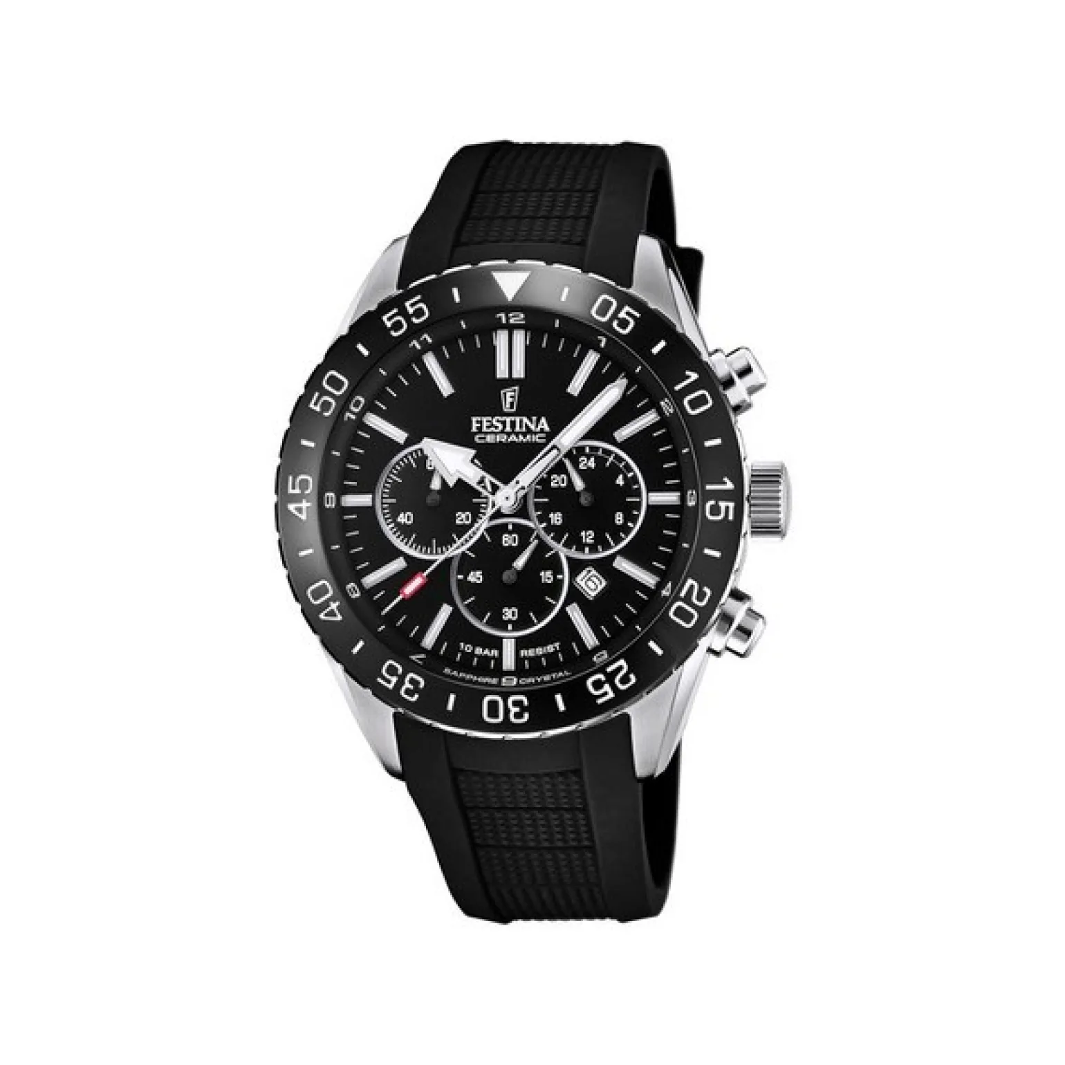 Keramikuhr von Festina in Silber mit schwarzem Zifferblatt und Kautschukarmband. Das Uhrengehäuse ist aus Silber mit einer Keramiklünette. Das Armband misst 22 mm in der Breite und hat ein einfaches, klassisches Design, das für verschiedene Sportarten geeignet ist.