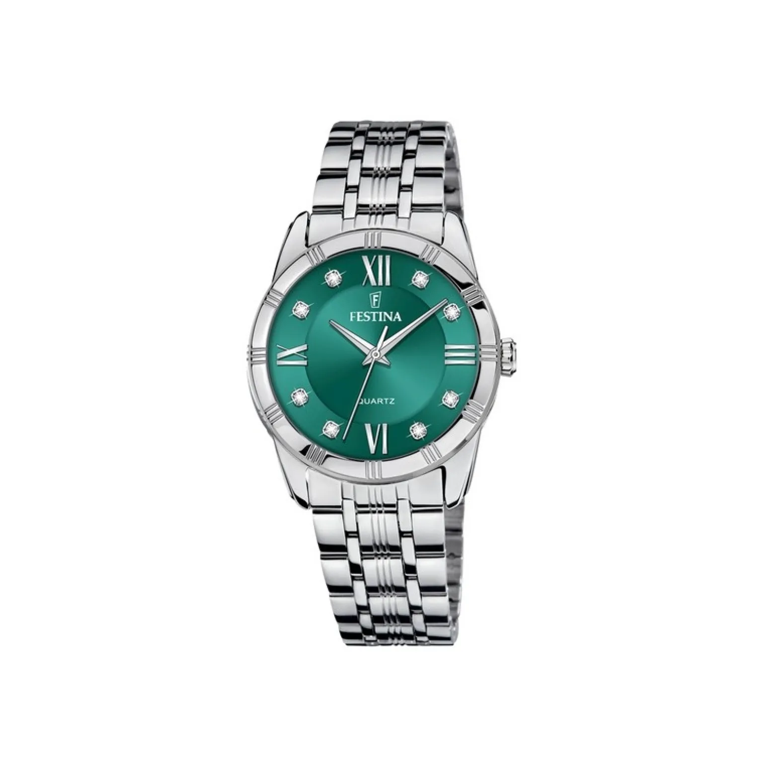 MADEMOISELLE Damenuhr aus Stahl von Festina. Die klassische Uhr hat ein markantes grünes Zifferblatt mit Zirkoniasteinen auf den Markierungen und dem Logo. Das Stahlarmband misst 16,8 mm in der Breite.