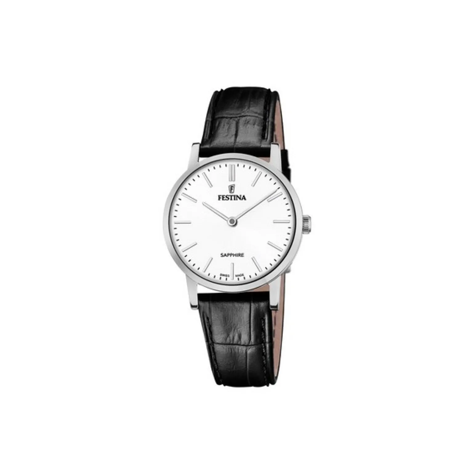 Festina – SWISS MADE Damenuhr aus Stahl mit schwarzem geprägtem Lederband