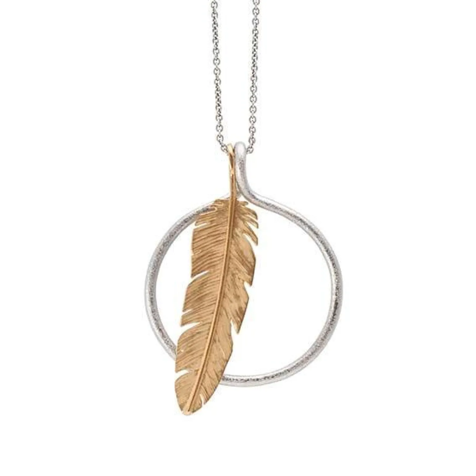 . Ein Traumfänger-Anhänger aus rhodiniertem Silber und ein Feder-Anhänger aus vergoldetem Silber. Beide in großer Ausführung.