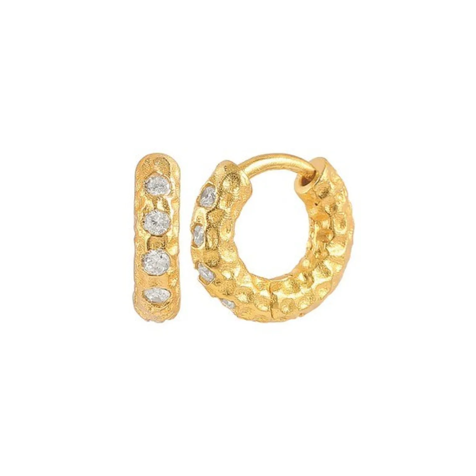 Wir wollen damit nicht sagen, dass an klassischen Reifen etwas auszusetzen ist. Wir sagen nur, dass diese klobigen Florence Hoops mit geschlagener Oberfläche und weißen, funkelnden Zirkonen cooler sind! Wenn Sie die traditionelle Kreole mit einem kleinen Extra herausfordern wollen, dann ist die Snowy Florence. genau das Richtige für Sie. Die Creolen von Florence sind aus 18kt. vergoldetem Sterlingsilber und haben einen Durchmesser von 12 mm. Die weißen Zirkone verleihen den ohnehin schon schönen Ringen noch ein wenig mehr Spiel.