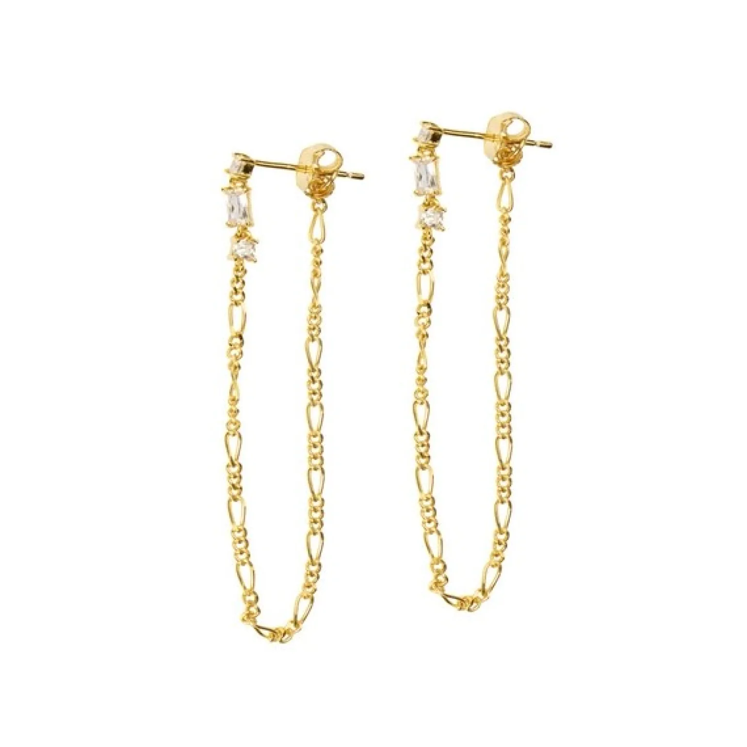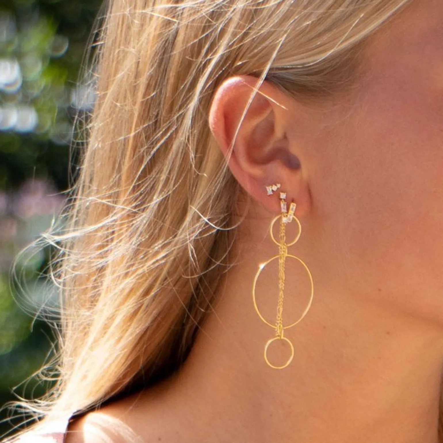 Die schönen langen Kettenohrringe hängen zart am Ohr und die klaren Zirkone funkeln, wenn sie das Sonnenlicht einfangen.