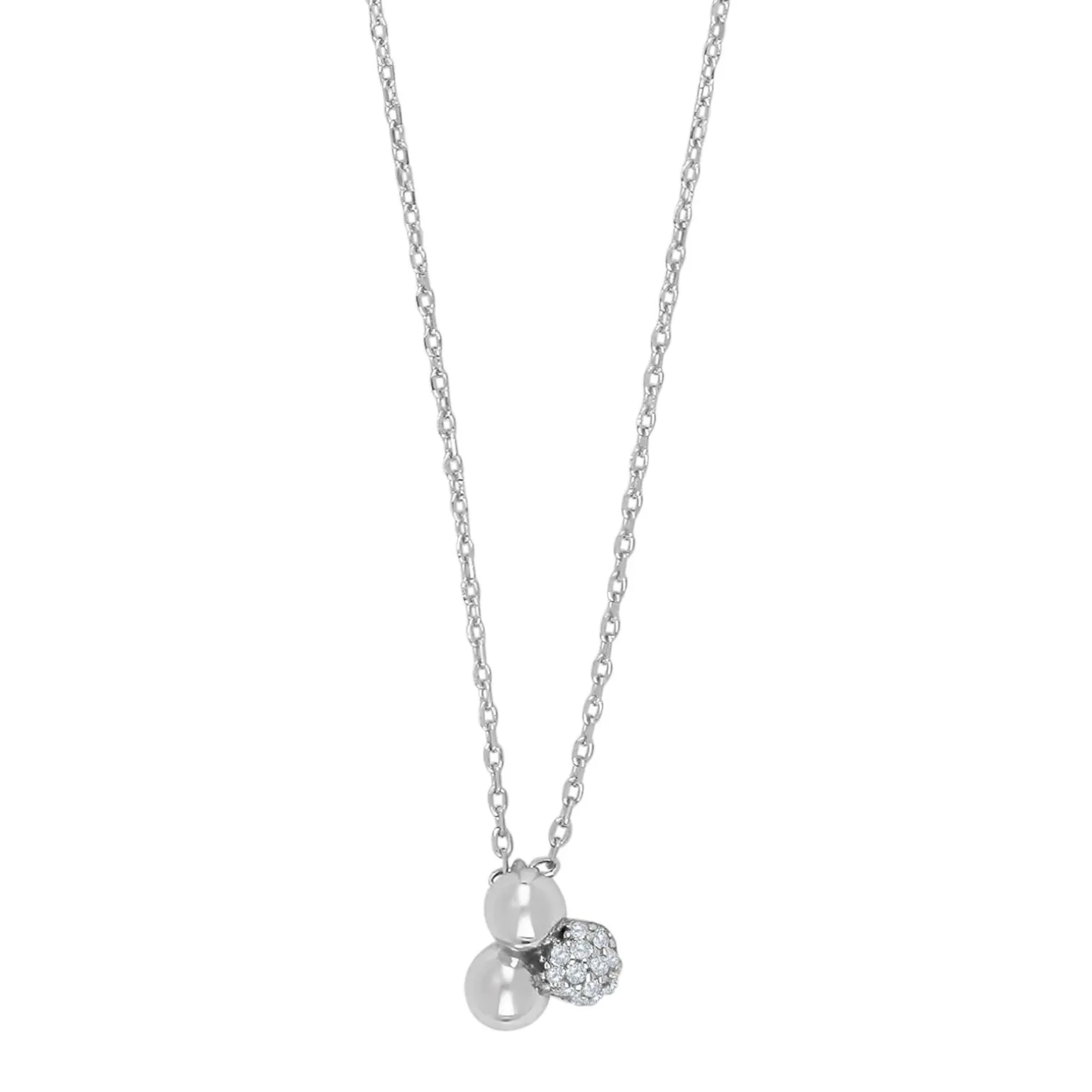 Sehr schlichte Olinanor-Halskette in rhodiniertem silber von Joanli Nor mit 3 identischen Kugeln und zirkonia . Die Halskette besteht aus einem Anhänger mit den Maßen 8 x 8,5 cm.