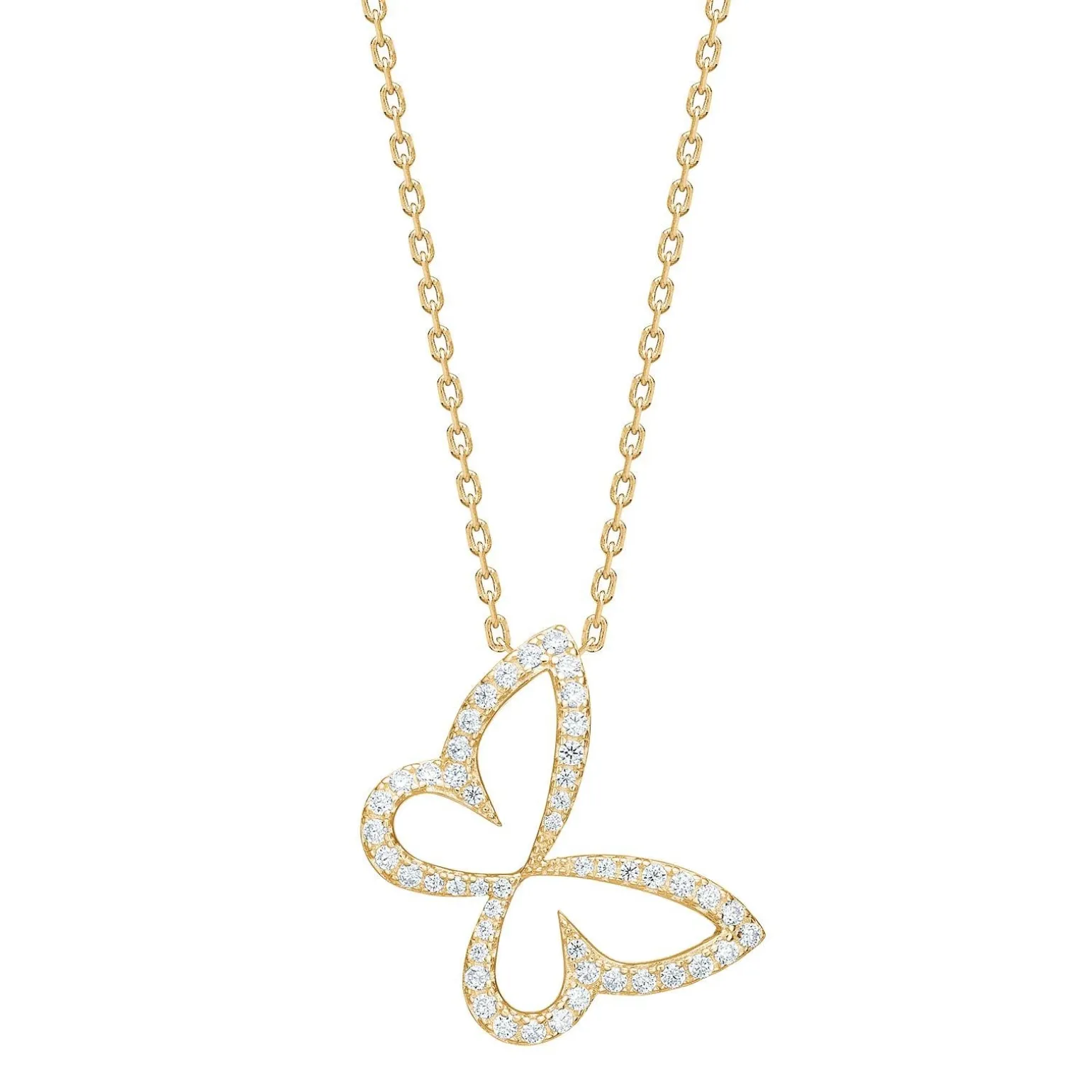 PamelaNor Halskette in vergoldete silber von Joanli Nor mit großem Schmetterling und weißen zirkonia . Die Halskette besteht aus einem Anhänger mit den Maßen 19 x 20 mm. in Durchmesser und die Halskette misst 42+3 cm.