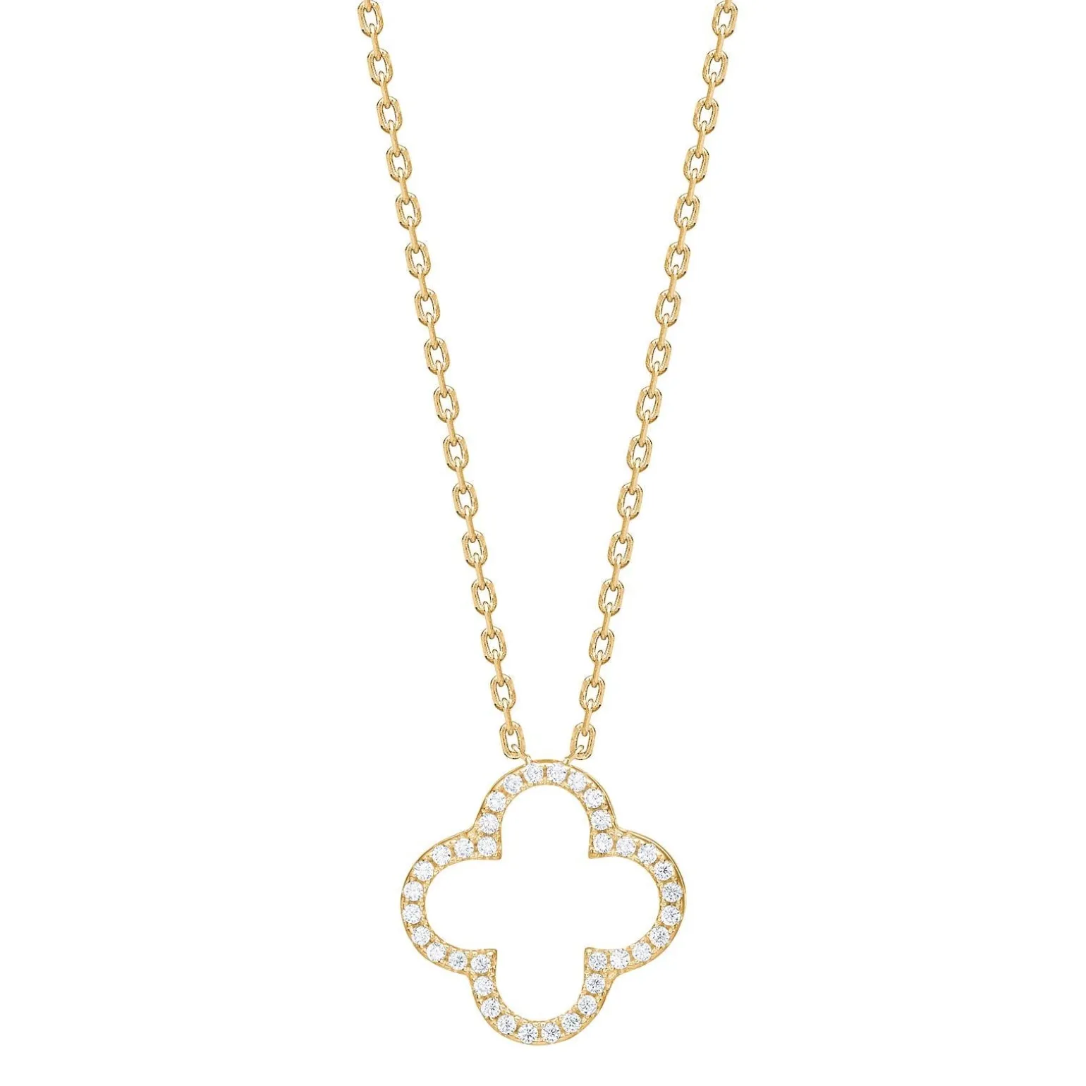 Halskette PamelaNor in vergoldete silber von Joanli Nor mit Kleeblatt-Anhänger und weißen zirkonia . Die Halskette besteht aus einem 14 mm großen Anhänger. in Durchmesser und die Halskette misst 42+3 cm.