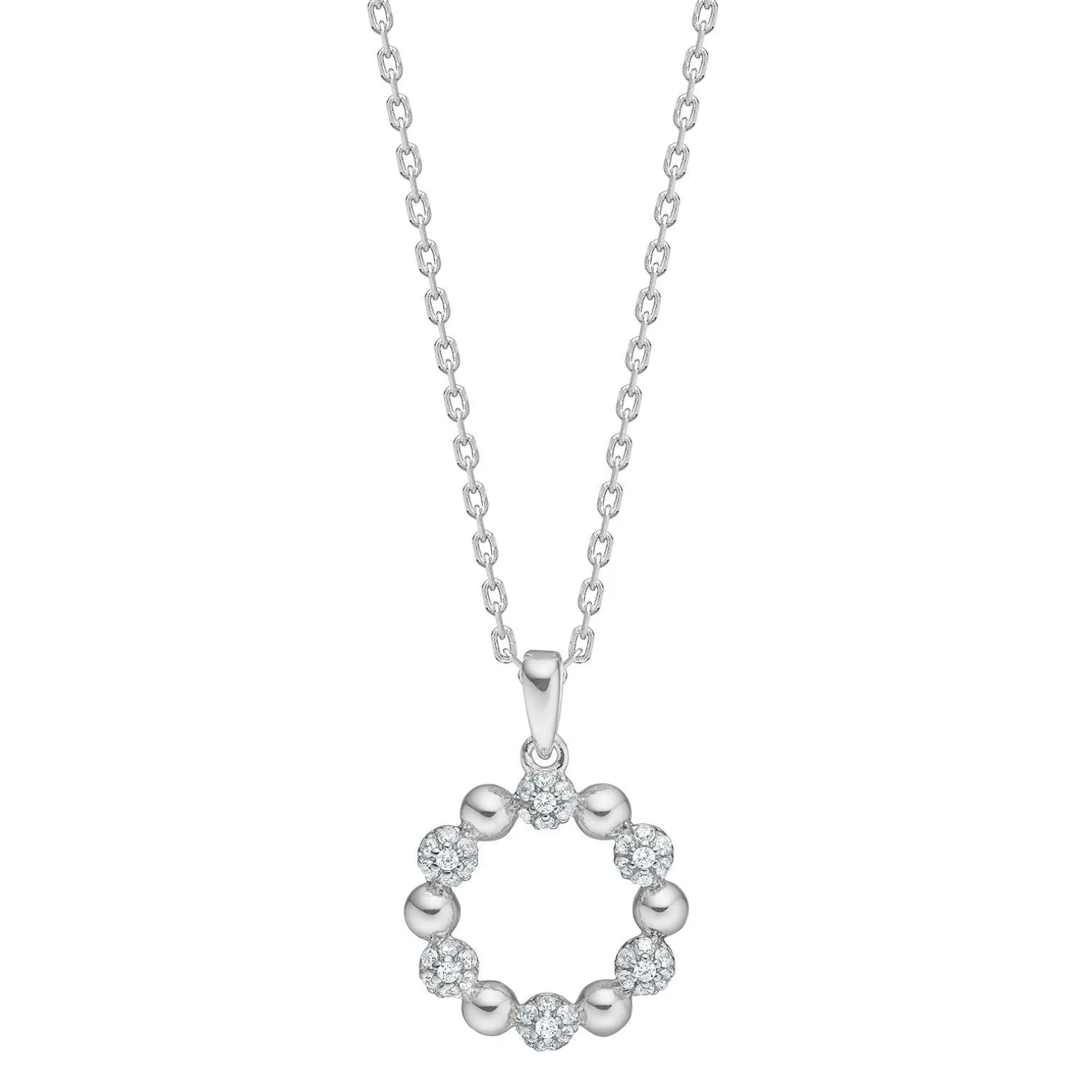 PennyNor Halskette in silber von Joanli Nor mit zirkonia . Die Kette hat einen runden Anhänger aus Kugeln, besetzt mit weißen zirkonia . Der Anhänger misst 12 x 18 mm. in Durchmesser und die Halskette misst 42+3 cm.