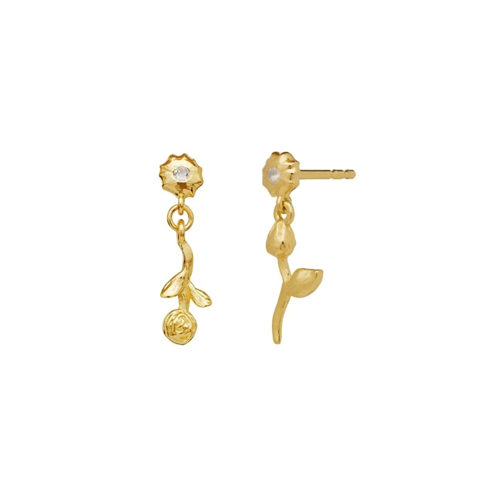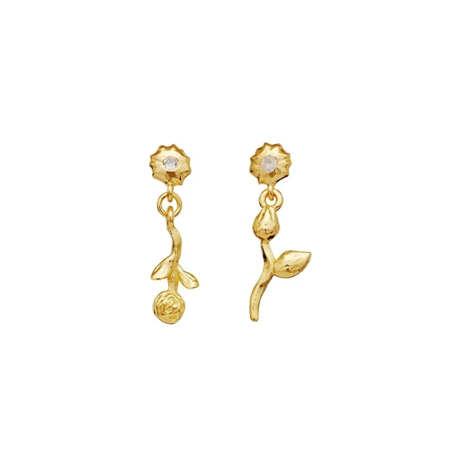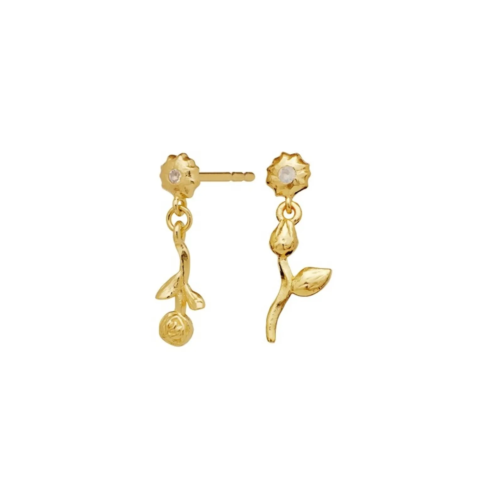 Amaria-Ohrringe in vergoldete silber von Maanesten mit asymmetrischen Rosenanhängern und den schönsten Mondsteinen in jedem Ohrring. Die Ohrringe werden auf der Rückseite mit einem Schmetterlingsverschluss geschlossen, sodass sie bequem in Ihren Ohren sitzen.