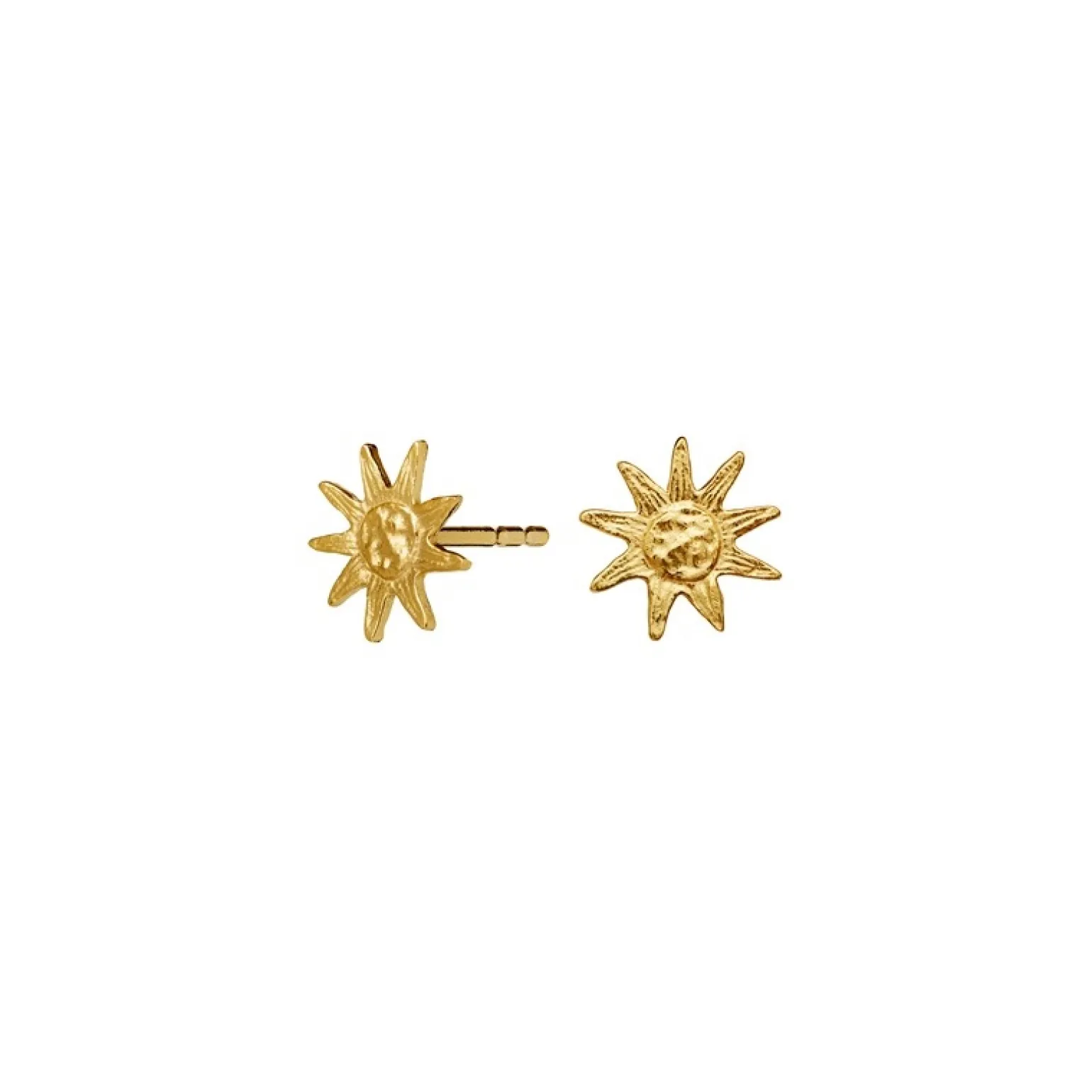 Juni-Ohrringe in vergoldete silber von Maanesten. Die kleinen Sonnenohrringe haben eine schöne gehämmerte Oberfläche und die Form grafischer Sonnen. Die Ohrringe haben einen Durchmesser in 8 mm und mit ihnen haben Sie die Sonne immer dabei.