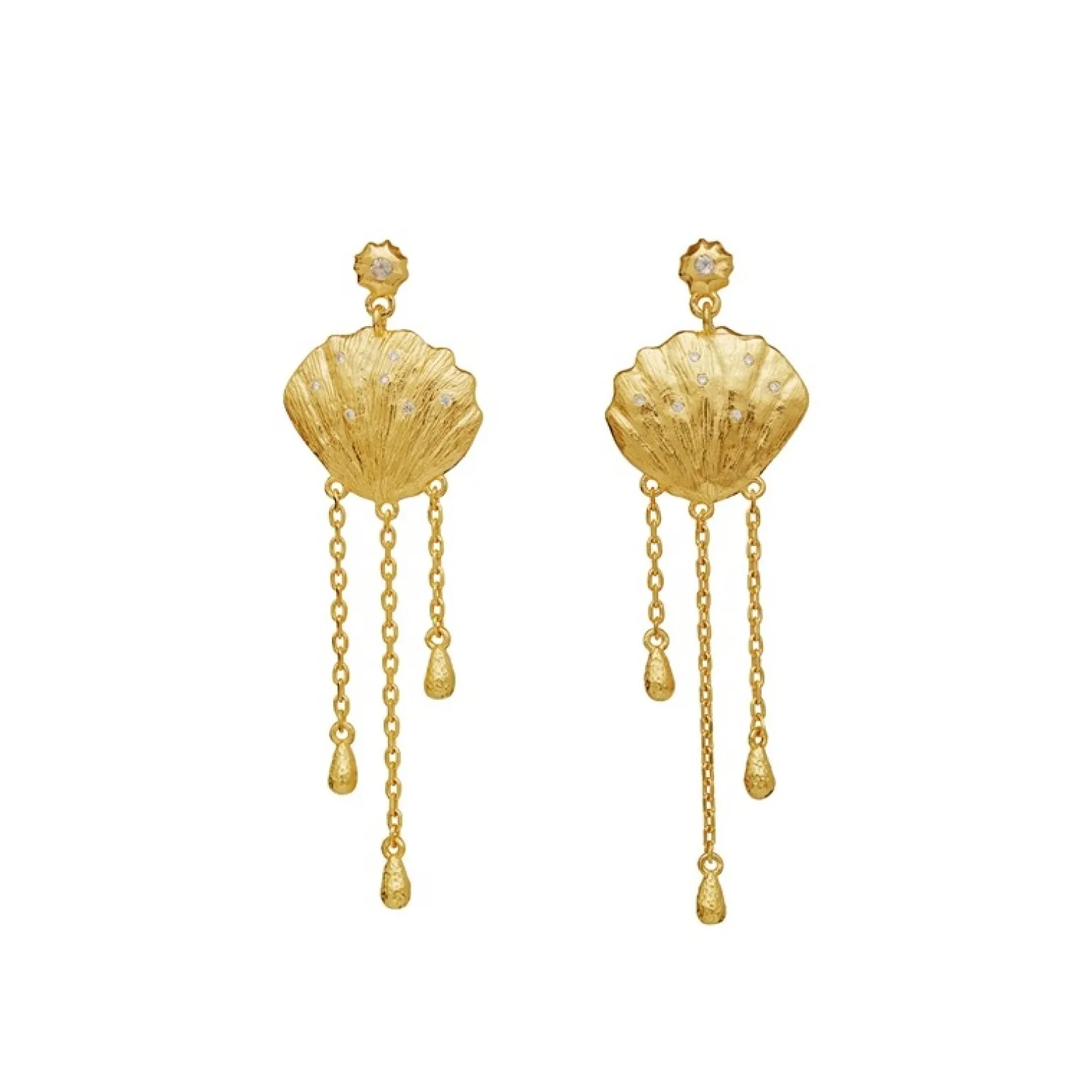 Meena-Ohrringe in vergoldete silber von Maanesten . Der Ohrring hat einen wunderschönen Anhänger, der eine Muschel darstellt, auf der Regenbogenmondstein und zirkonia eingefasst sind. Als Erinnerung an die unendliche Schönheit, die unter der Meeresoberfläche liegt.