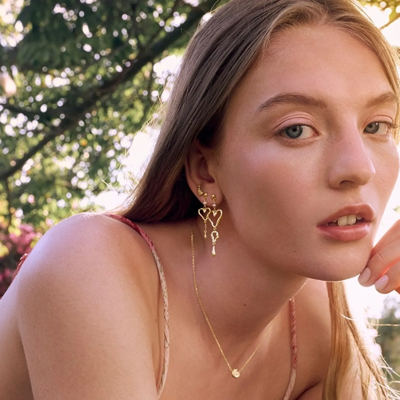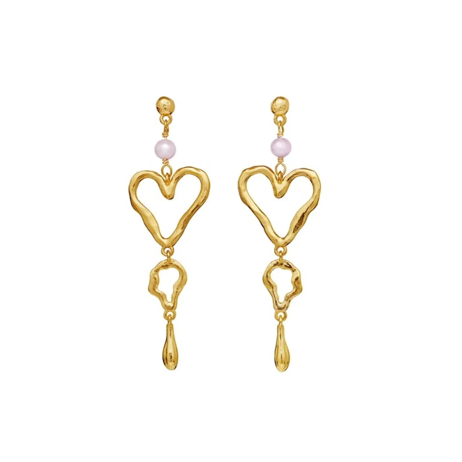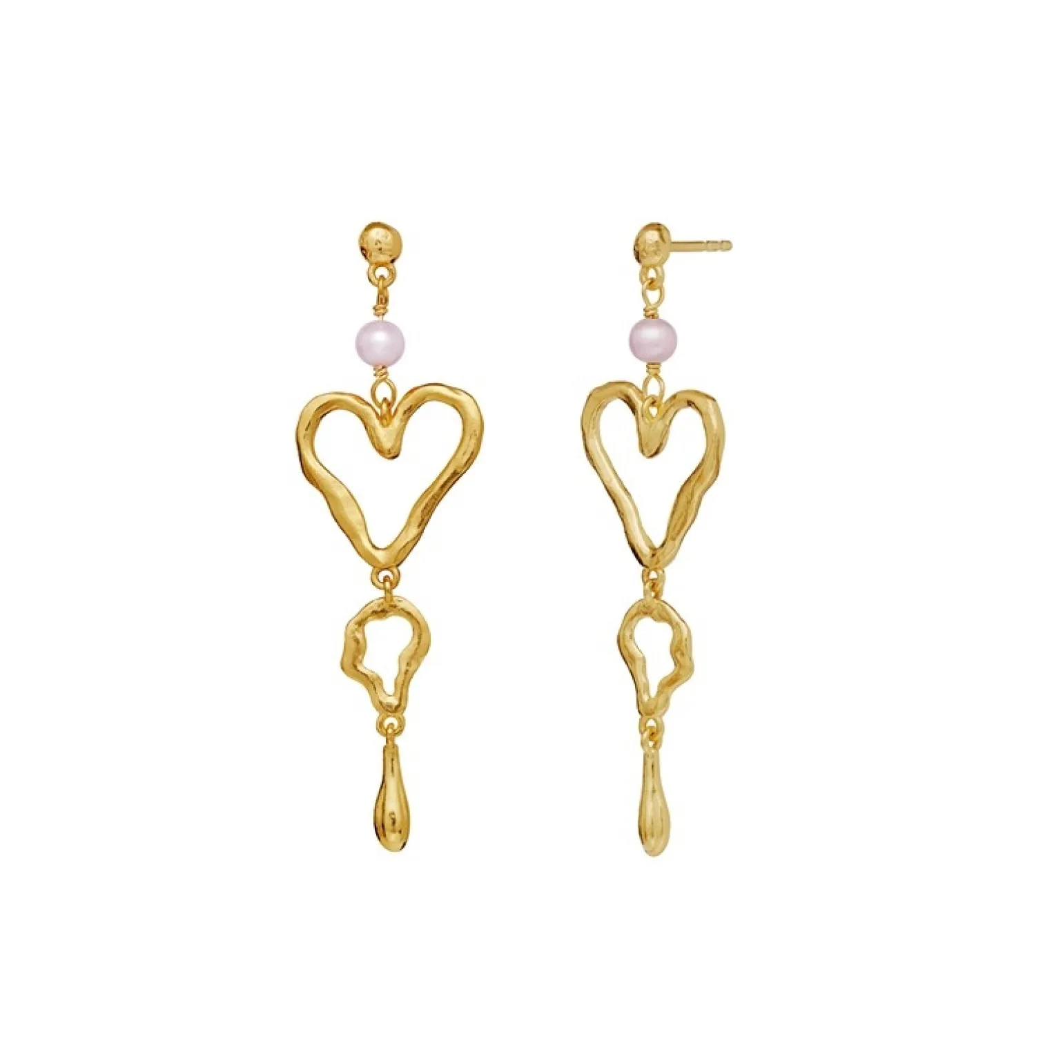 Die Ohrringe sind als Ohrstecker gefertigt, an denen ein Anhänger bestehend aus einer rosa Süßwasserperle, einem Herz und einem vergoldete Tropfen hängt.