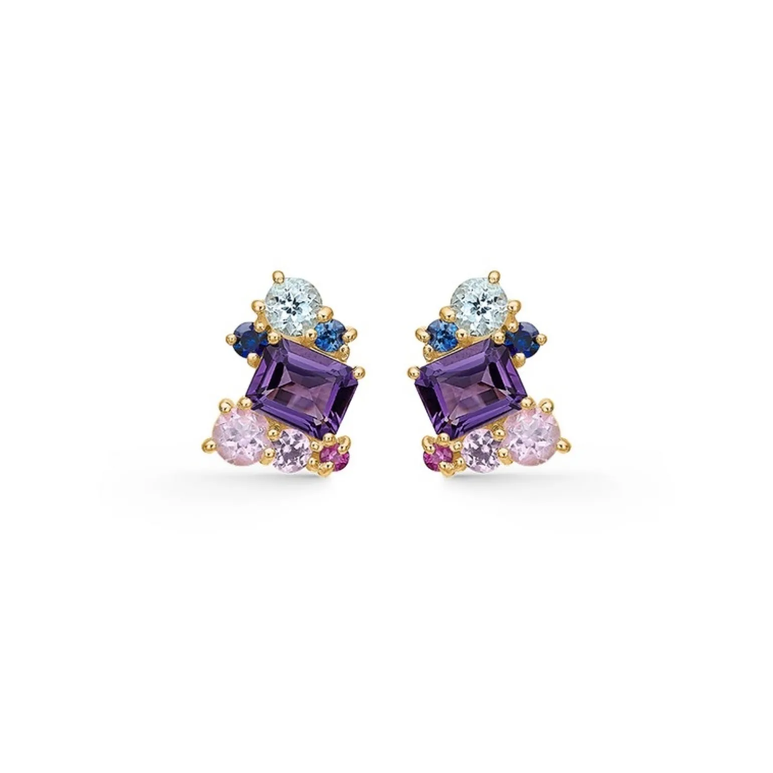 Die Four Seasons Summer Ohrringe aus 14 kt Gold mit wunderschönen Edelsteinen von Mads Z. Die Steine in den lila Farbtönen sind: Amethyst, rosa Amethyst, rosa Saphir, Rubin, Saphir, Saphir, Ceylonsaphir und sky blue Topas