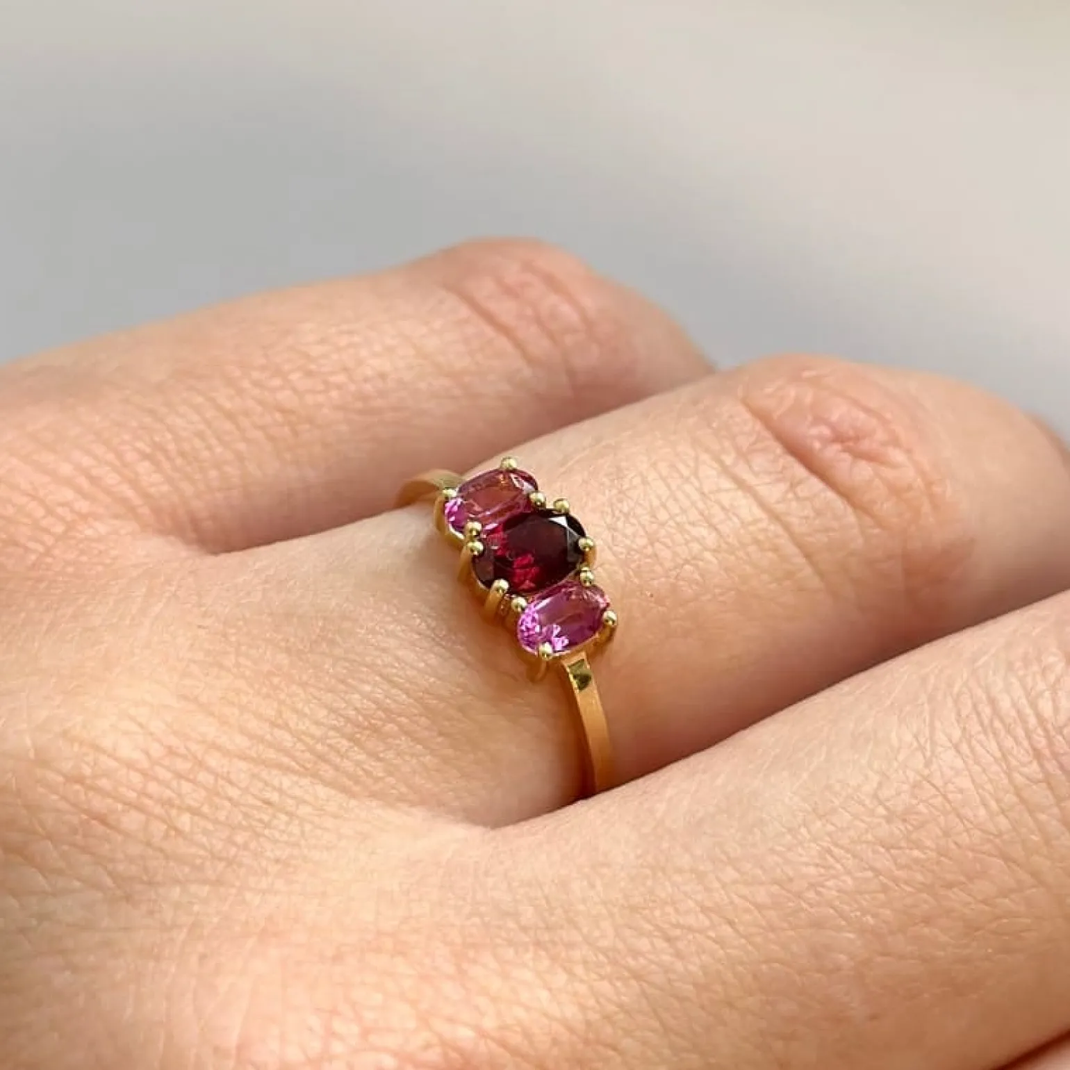 Hyacinth ring aus 8 kt Gold mit rosa Topas und Rhodonit von Mads Z WHITE LABEL. Die drei Steine sind in zwei schönen Farben in rötlichen Schattierungen mit einem dunklen Stein in der Mitte gefertigt.