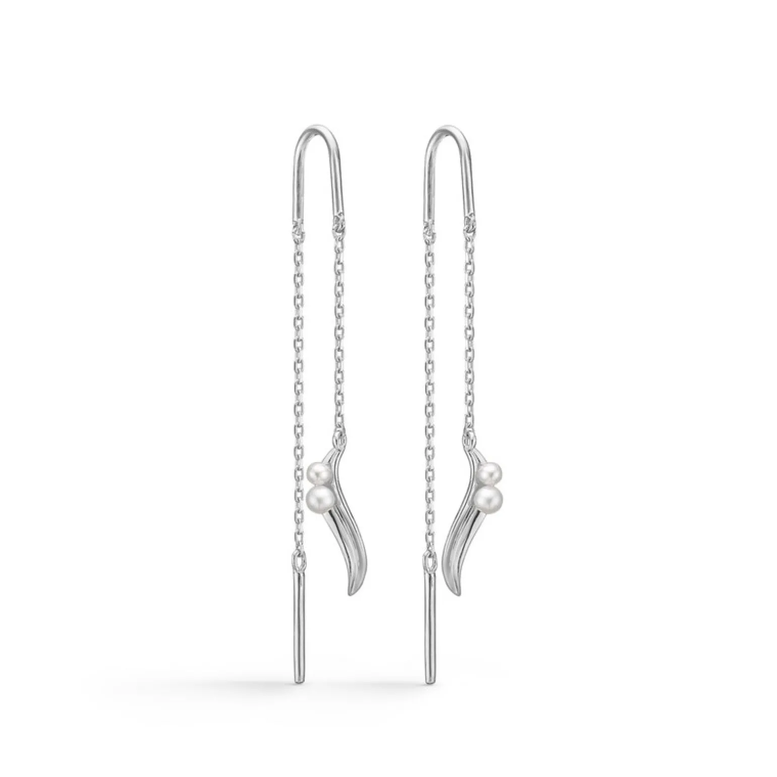 Silber Morning Dew Ohrringe von Mads Z mit Zuchtperlen. Die langen Kettenohrringe sitzen durch das Ohr mit einem Ring in der Mitte der Kette und Perlen an den Anhängern am Ende der Ohrringe.