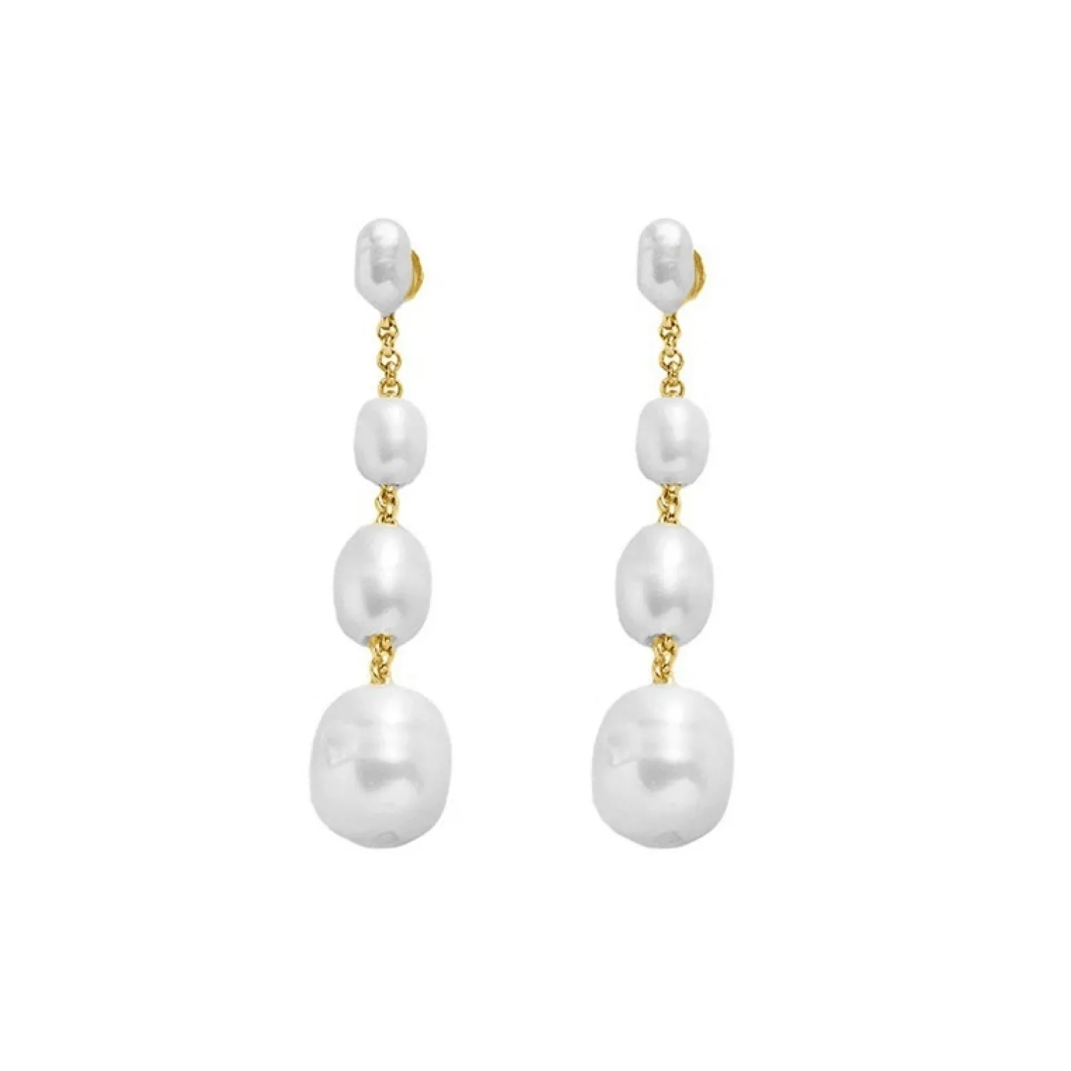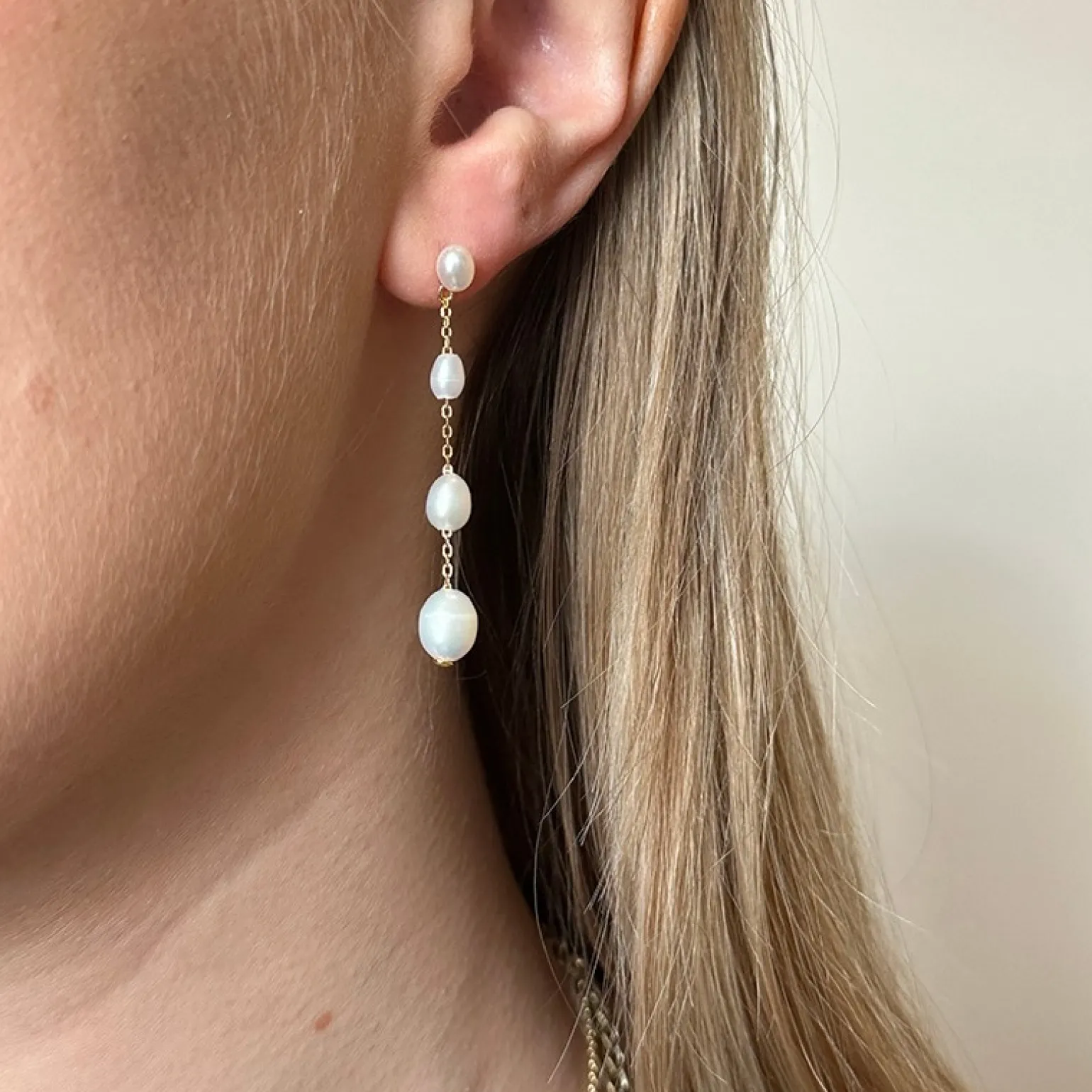 Perlenohrringe „Carola“ in vergoldete silber von Merleperle mit 4 in großen Süßwasserperlen an jedem Ohrring. Die Ohrringe sind 50 mm in .