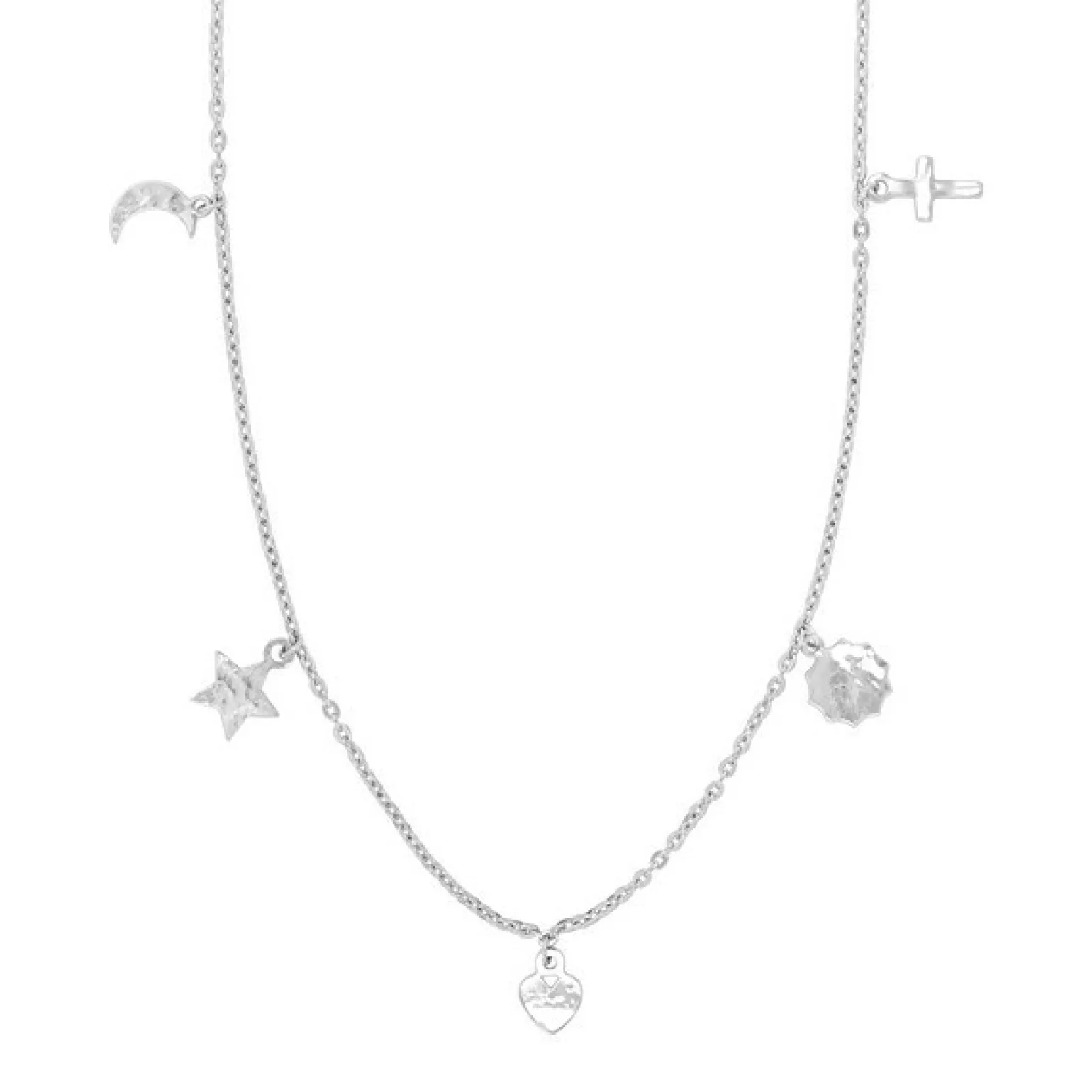 Feine Halsketten kann man gar nicht genug haben, warum also nicht diesen schönen Stil in Ihr Schmuckkästchen aufnehmen? Die Halskette ist aus rhodiniertem Sterlingsilber gefertigt und hat 5 Petit Amulette als Anhänger: einen Mond, einen Stern, ein Herz, eine Sonne und ein Kreuz. Die Halskette misst 45+5cm und ist natürlich auch in vergoldet erhältlich.