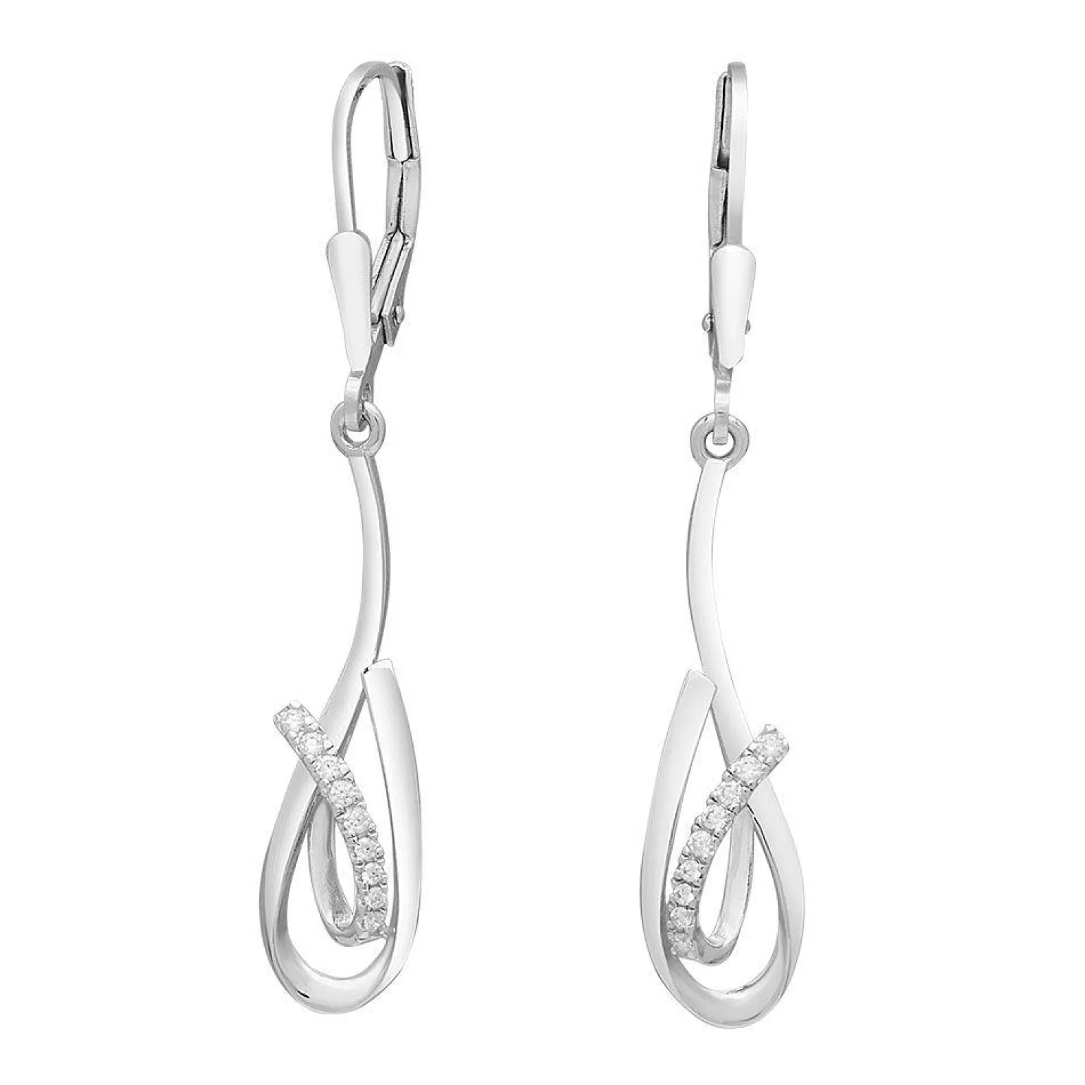 Ohrringe aus Silber mit den schönsten klaren Zirkonen. Der Anhänger selbst misst 2,8 cm und besteht aus einem einfachen Silberdraht, der sich um sich selbst faltet.