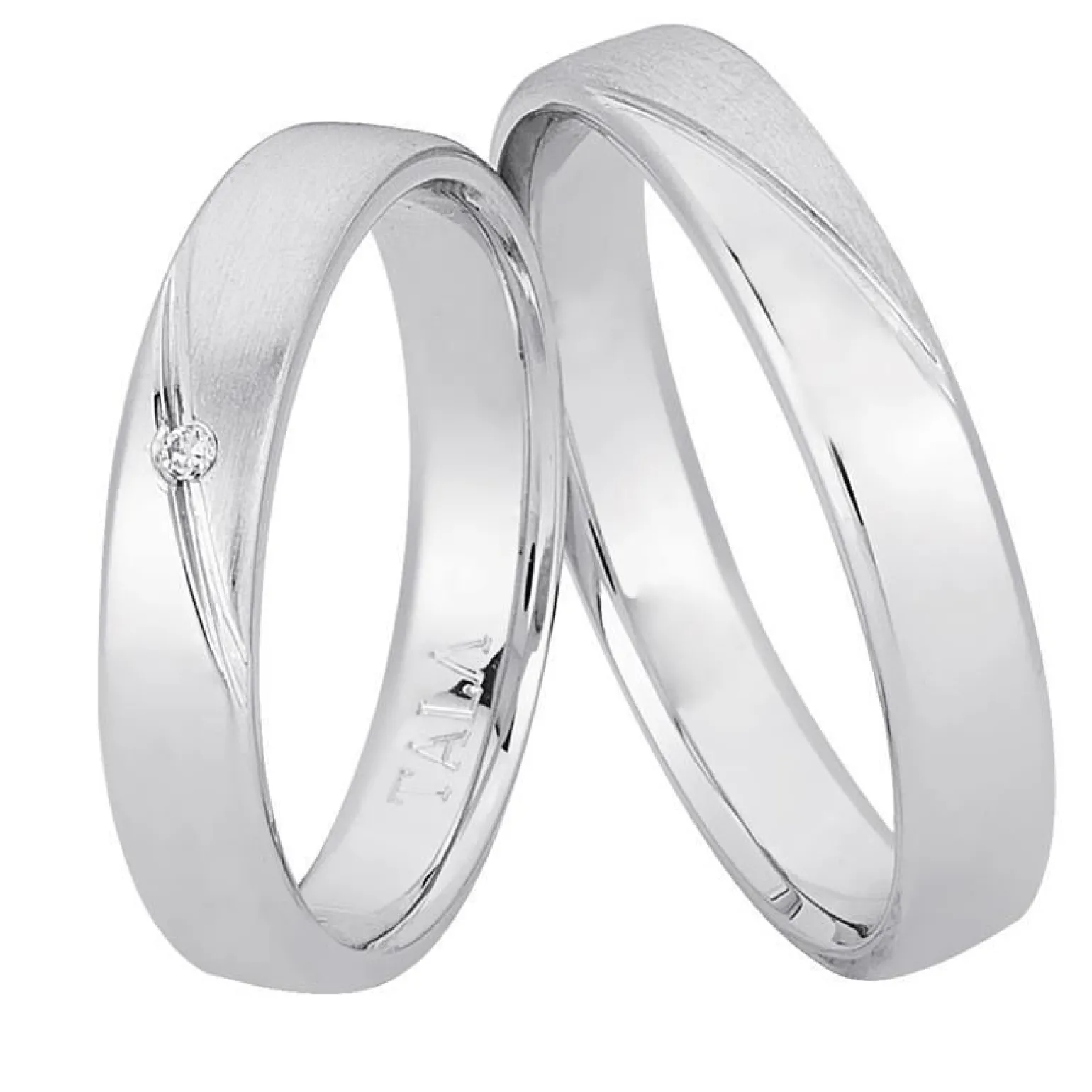 Rhodinierte Eheringe aus Silber mit 5 Diamanten im Damenring