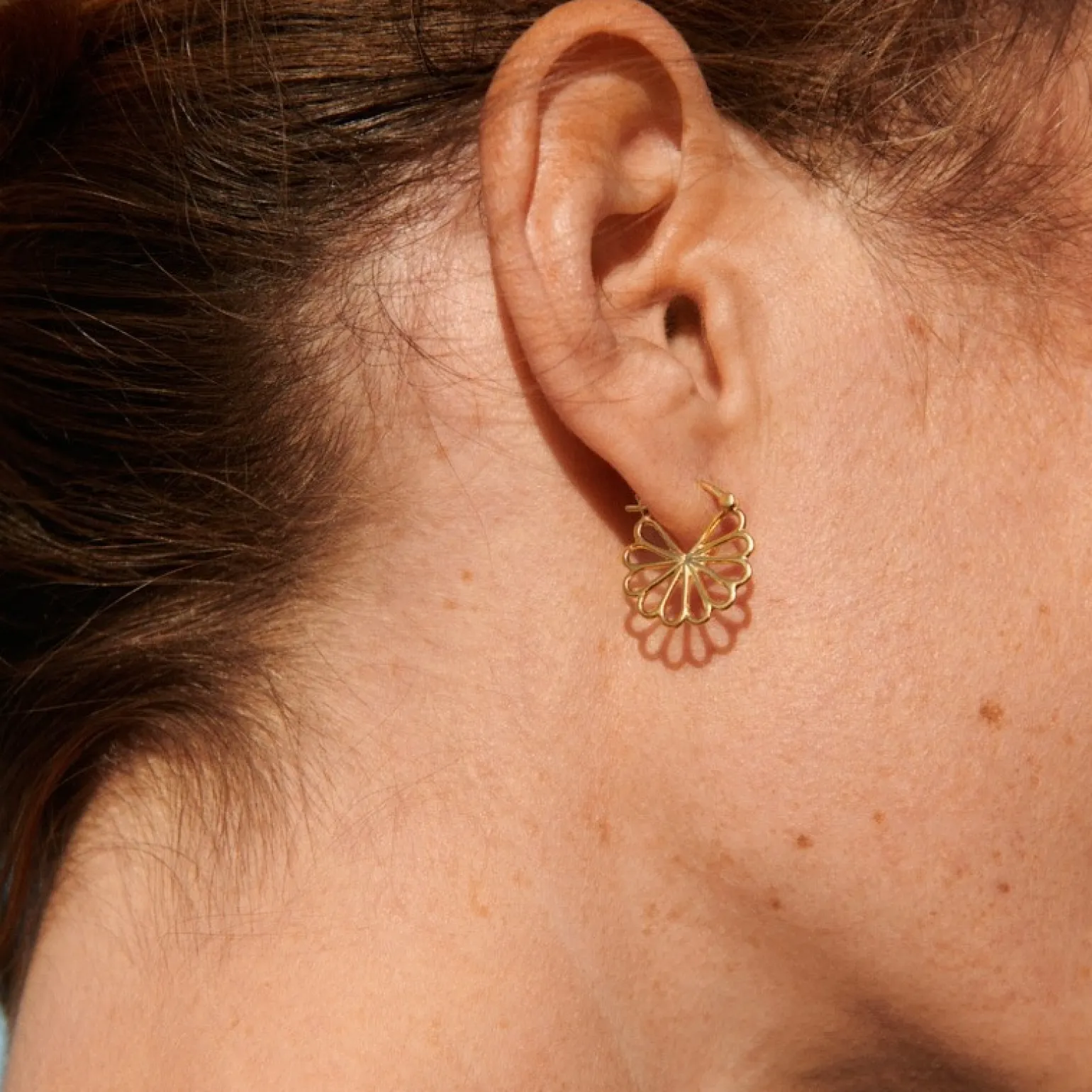 Bellis Ohrringe in 18 Karat vergoldete silber von Pernille Corydon Die Bellis Ohrringe sitzen wie Creolen mit der zarten Blütenform unter dem Ohr.