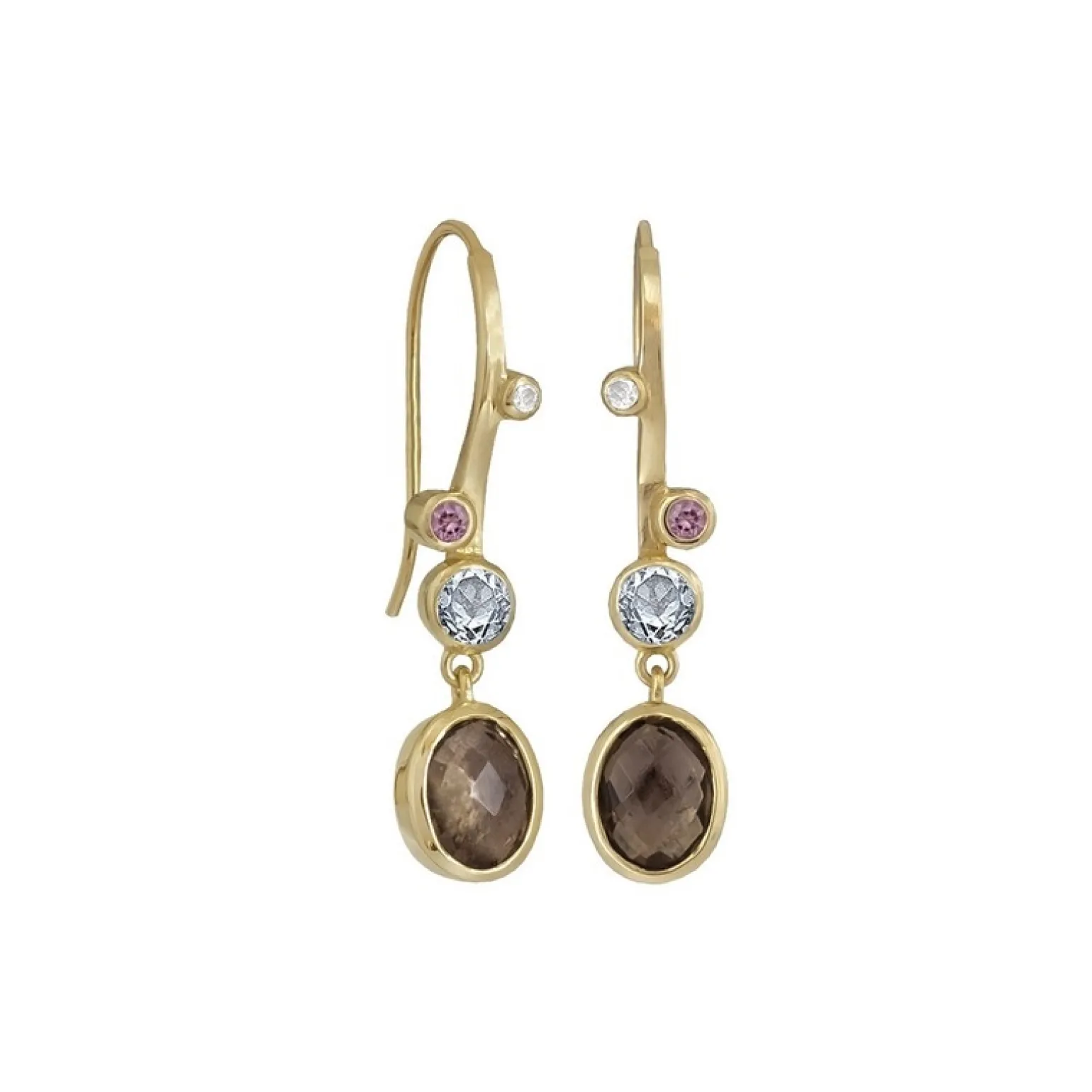 Glam Ohrhänger in vergoldete silber mit Steinen wie Rauchquarz, himmelblauem Topas, rosa Turmalin und weißem Topas. Die Ohrringe sind von Danish Rabinovich und es gibt eine passende Halskette.