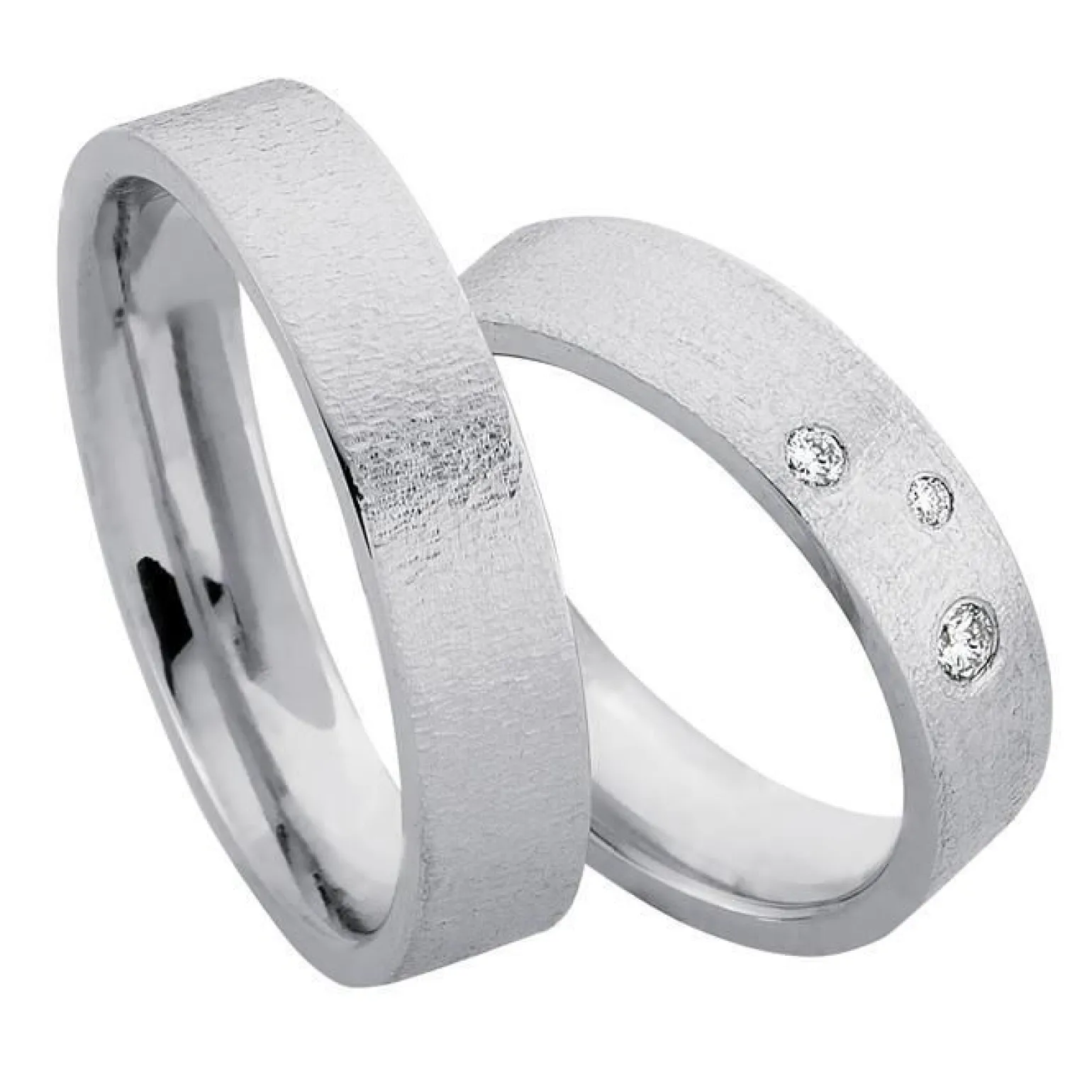 Rhodinierte Eheringe aus Silber mit 5 Diamanten im Damenring