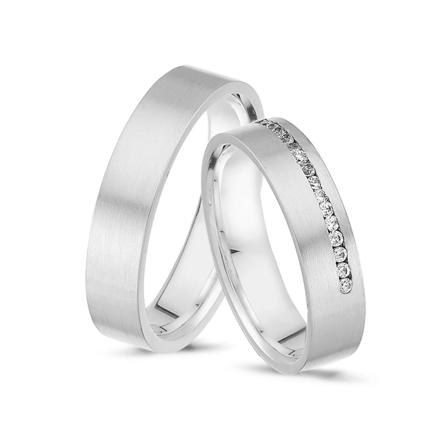 Rhodinierte Eheringe aus Silber mit 5 Diamanten im Damenring