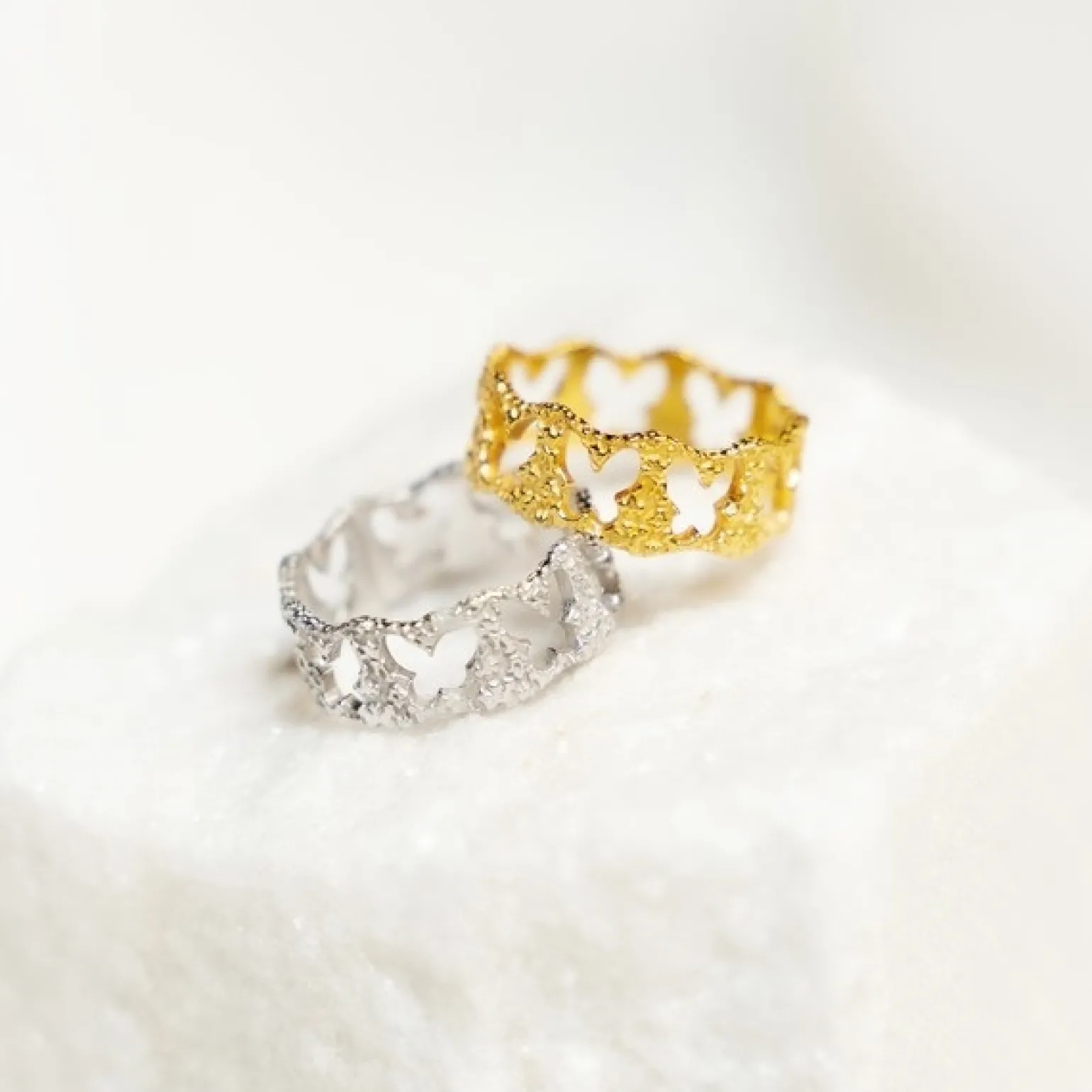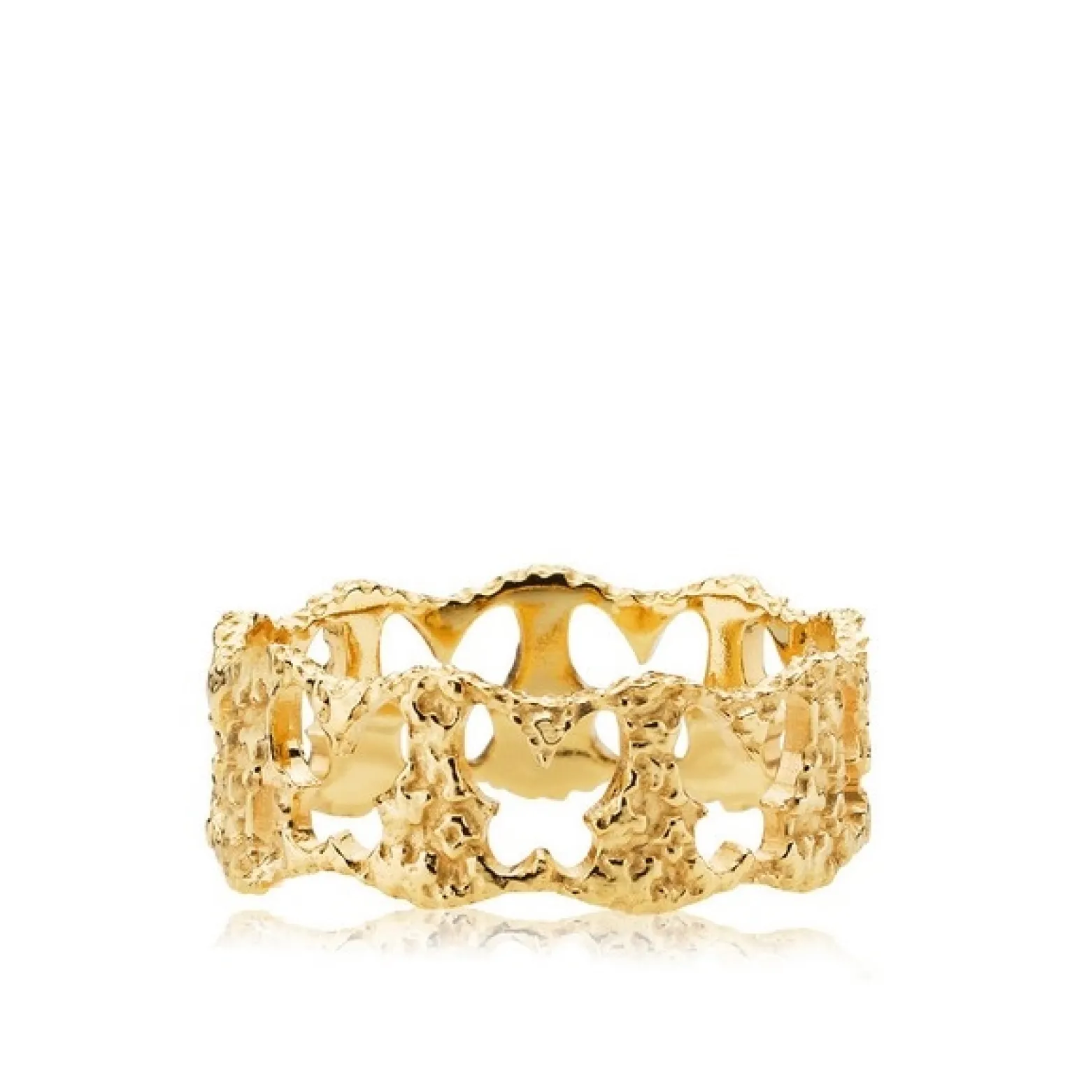 Vergoldeter Ring Silber von Sara Høydahl x Sistie Der schöne breite Ring misst etwa 7 mm in der Breite und hat feinste Schmetterlingssilhouetten in der Oberfläche. Der Schmuck von Sistie besteht zu 100% aus recyceltem Silber und ist hier vergoldete mit 18-karätigem Gold versehen.