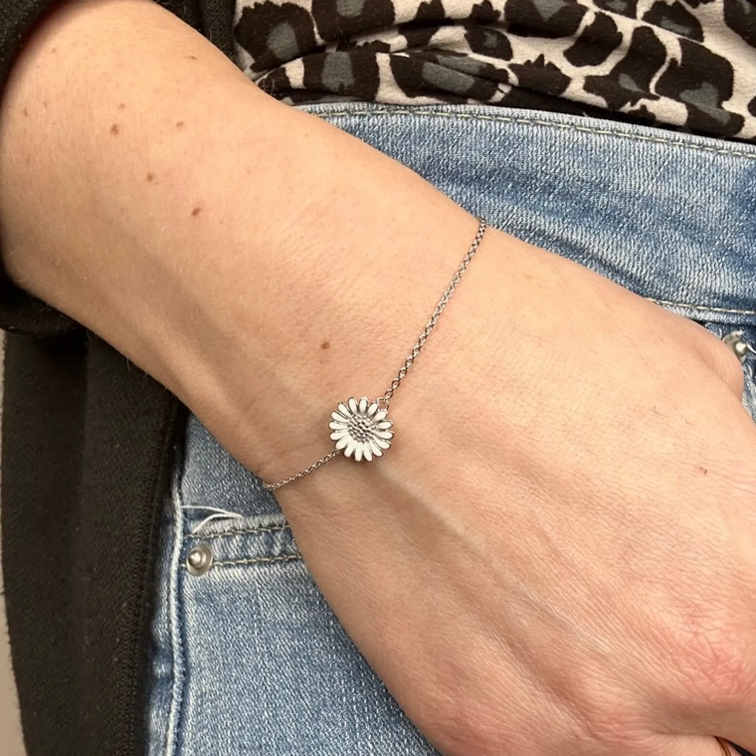 Armband mit kleinem Gänseblümchen-Anhänger an der Kette selbst. Das Armband besteht aus Sterlingsilber mit einem kleinen weißen Emaille-Gänseblümchen und ist von Siersbøl. Mit den Maßen 16+3 cm in der Länge und einem Gänseblümchen von 11 x 11 mm ist es ein armband, das in der Länge verstellt werden kann.