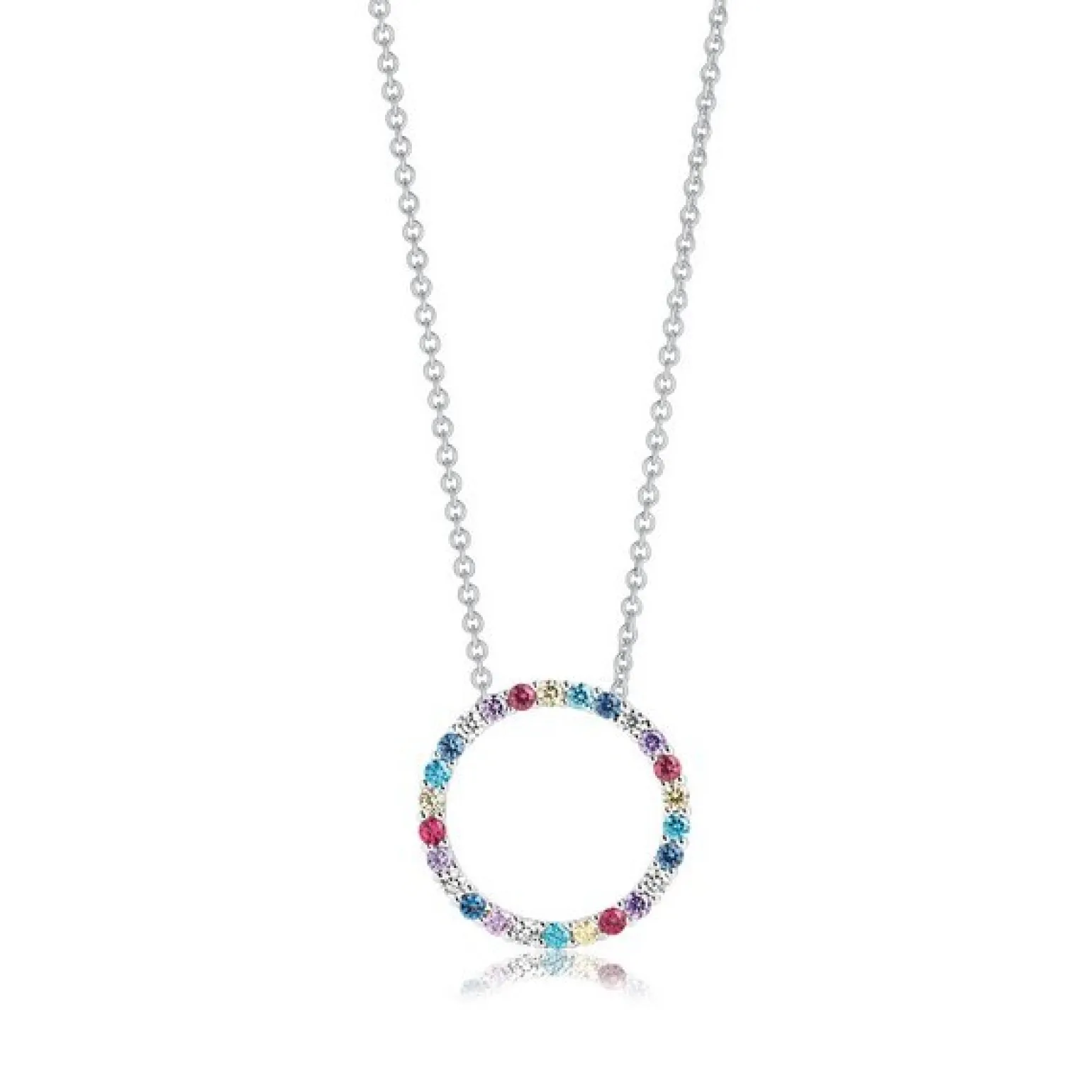 Biella-Halskette mit rundem Anhänger und schönen farbigen Zirkonen. Die Halskette von Sif Jakobs ist ein ewiger Klassiker und kann von jedem getragen werden. Der Durchmesser des Anhängers beträgt 22 mm.