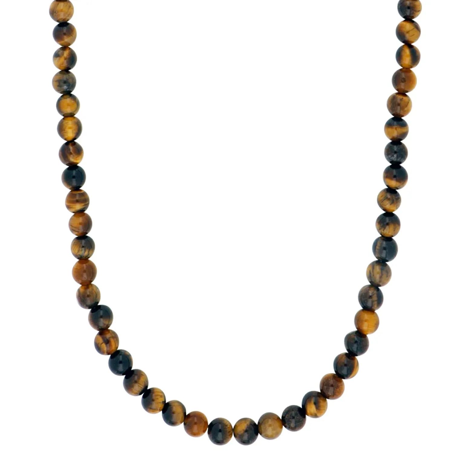 Halskette für Männer mit echten Tigeraugenperlen von Son of Noa. Jede Perle hat einen Durchmesser in ca. 6 mm und sitzt an einer langen Halskette.