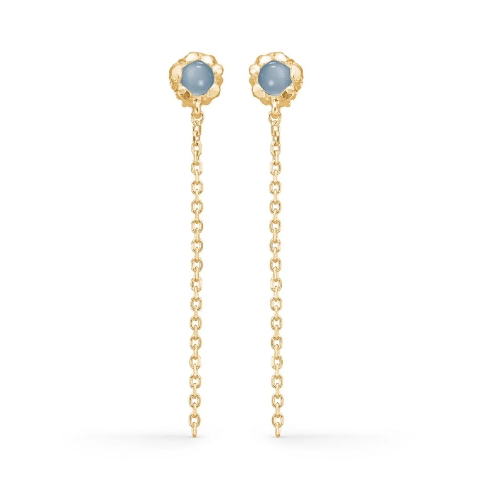 Magma-Ohrringe mit blauem zirkonia und einer feinen Kette. Eine einzigartige Kreation, inspiriert von fließender Lava über rohem Gestein. Diese Ohrringe von Studio Z sind ein poetischer Ausdruck der Naturgewalten, bei denen das Blau zirkonia wie flüssige Lava im Spiegelbild des Mondes schimmert.