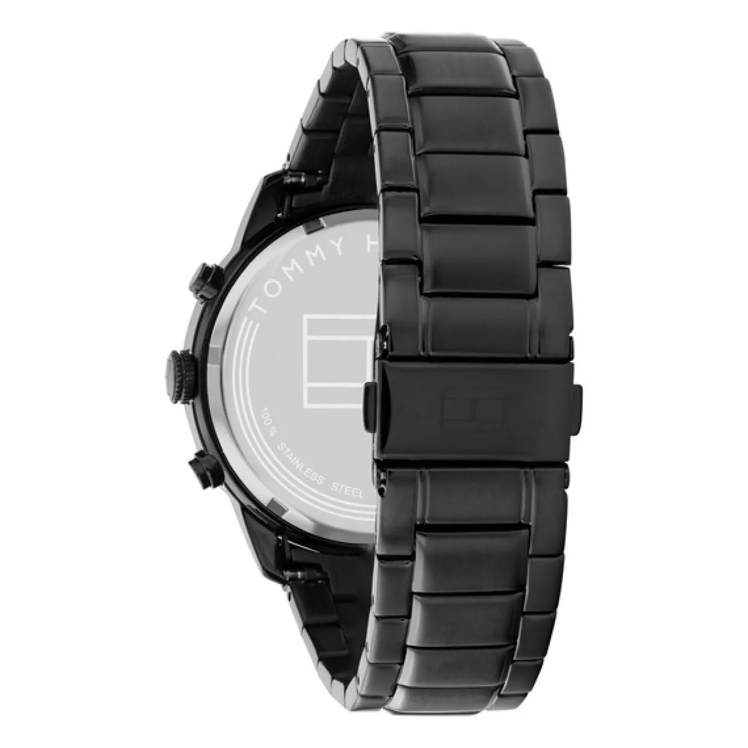 Exklusive Herrenuhr von Tommy Hilfiger mit schwarzem IP-Stahlgehäuse und schwarzem Stahlarmband. Das Zifferblatt ist schwarz und die Uhr hat ein Quarzwerk, 3 Chronographen und bis zu 5atm Wasserdicht. Gewicht 132 g.