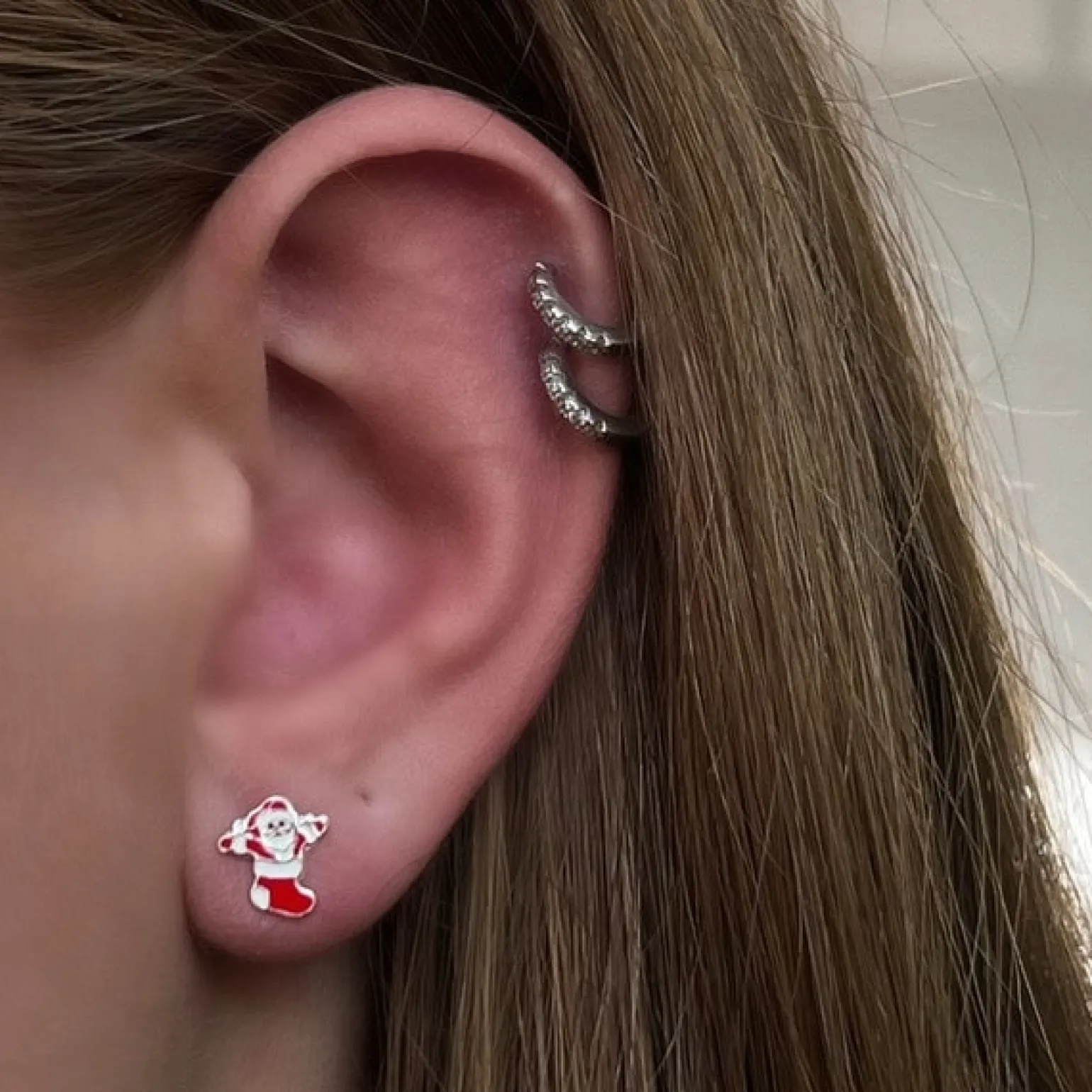 Feine Weihnachtsohrringe in silber mit Weihnachtssocken mit einem Kobold ByBirch. Die Ohrringe messen 6×8 mm.